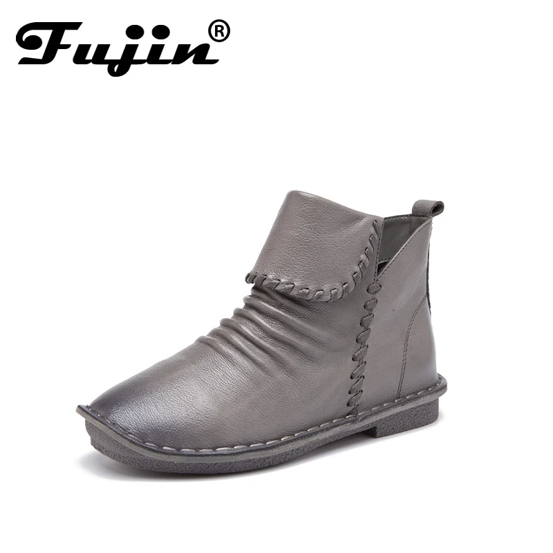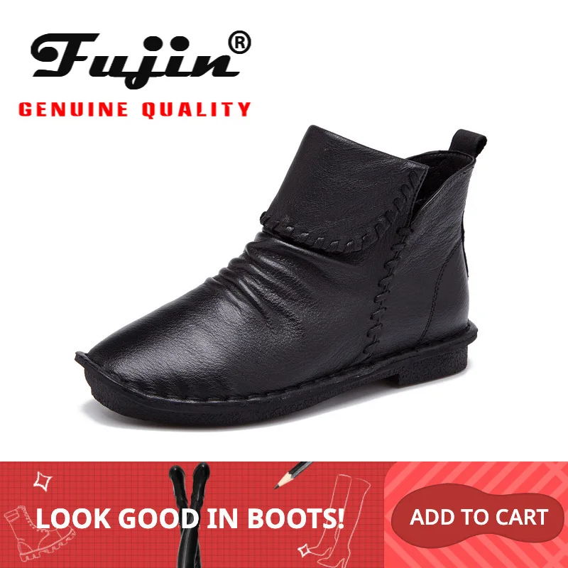Женские ботинки из натуральной кожи Fujin, Черные ботильоны ручной работы, на низком каблуке, без застежек, с круглым носком, Осень-зима 2021