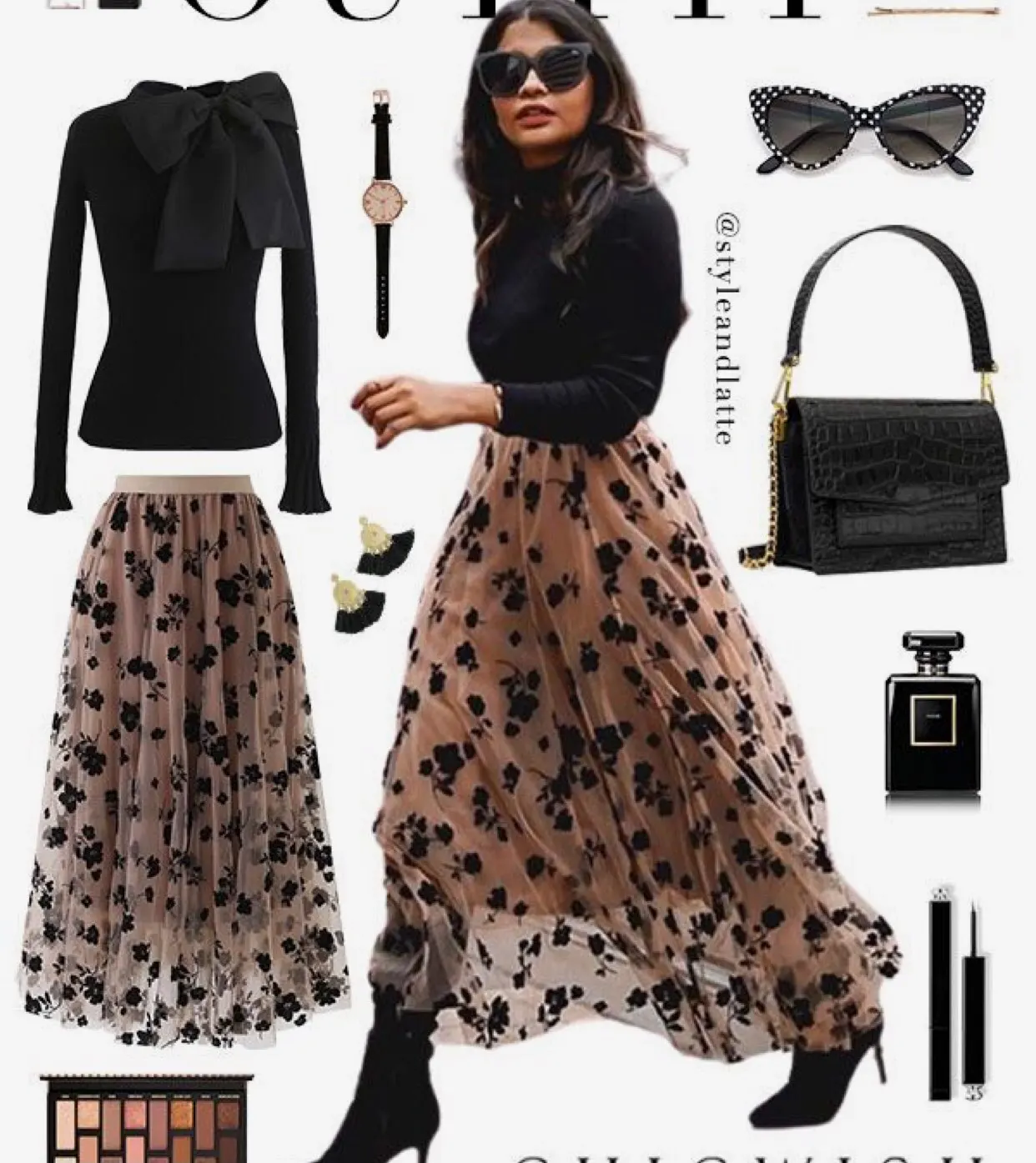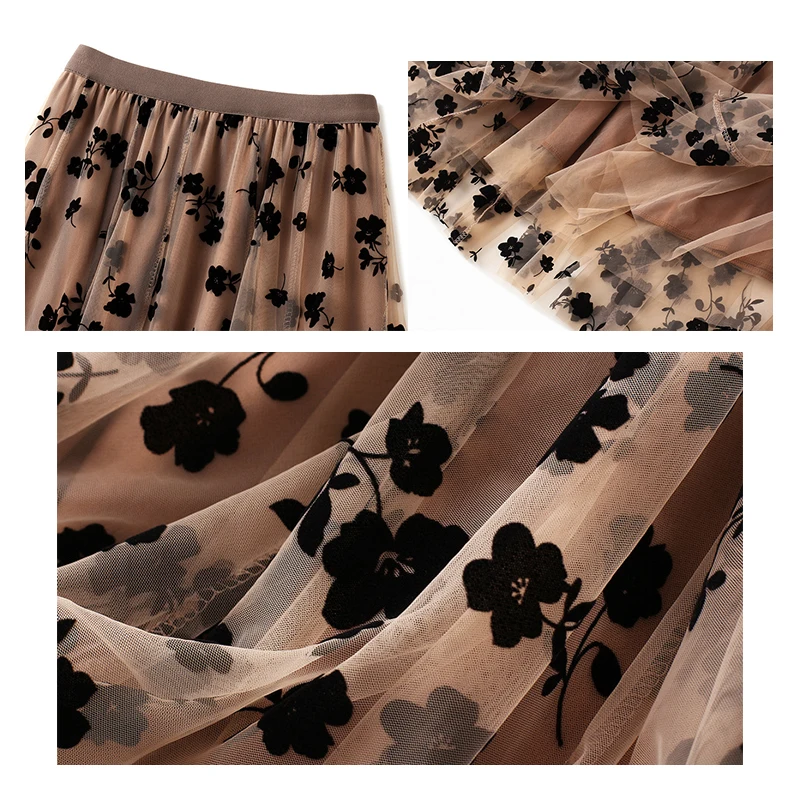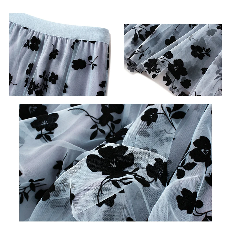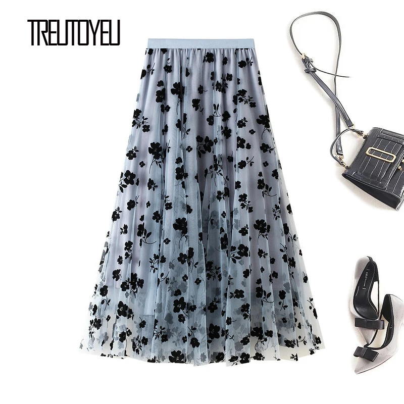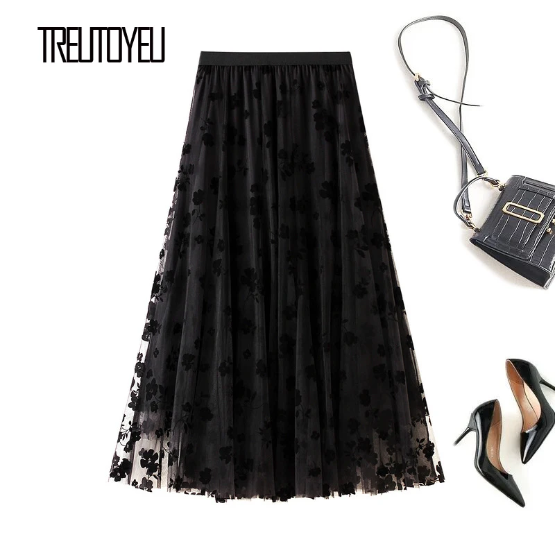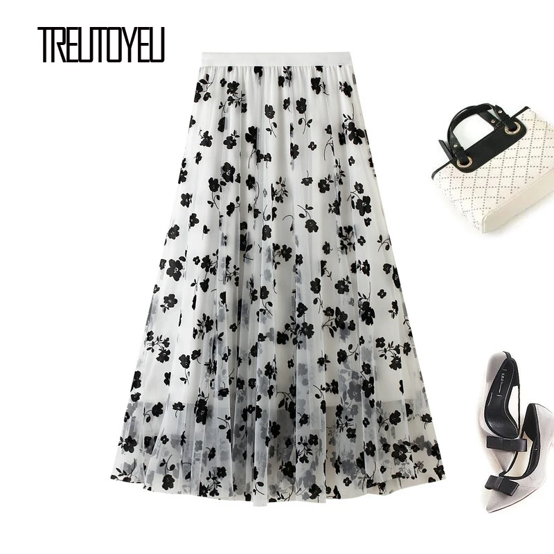 Женская юбка с цветочным принтом Treutoyeu, черная трапециевидная сетчатая длинная юбка из тюля с высокой талией и эластичным поясом, 2020