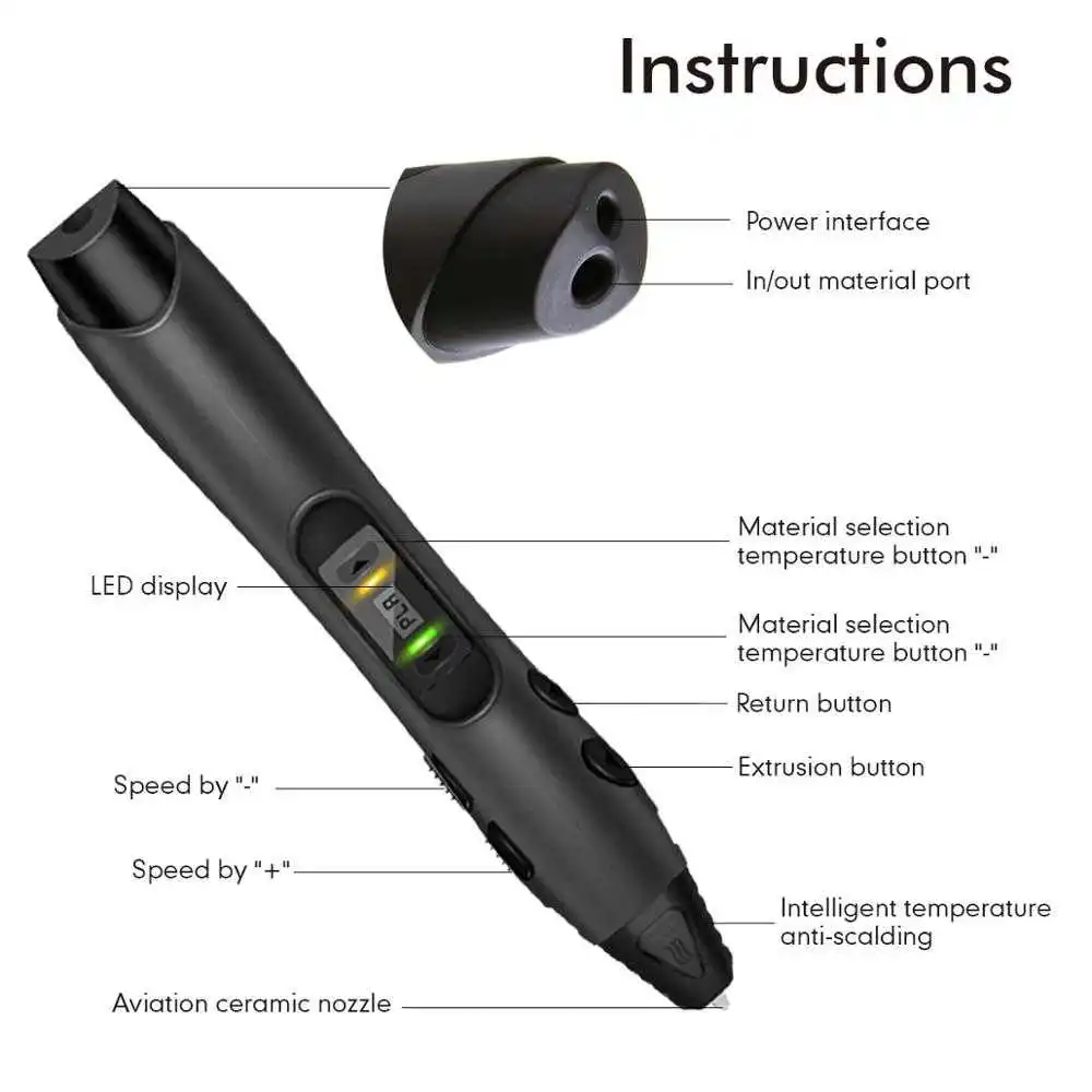1. Поддержка PLA/ABS/PCL 3D нитей, низкая температура и Общая температура регулируются; 2. Светодиодный экран, возможна смена температуры; 3. Низкая температура PCL нитей, не приводит к ожогам; 4. Восемь цифровых экструдированных рангов по контролю скорости; 5. Порт USB: Внешний внешний аккумулятор доступен. 6. Съемная насадка, без блока. 7. Послепродажное обслуживание: через год после даты доставки, повреждения, вызванные использованием нити с неоригинальным брендом или не строго следуя руководству пользователя, аннулируют гарантию.