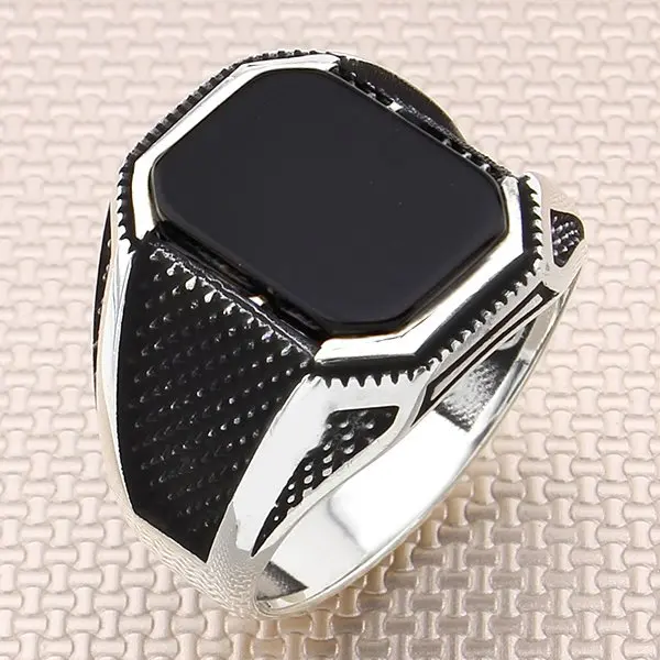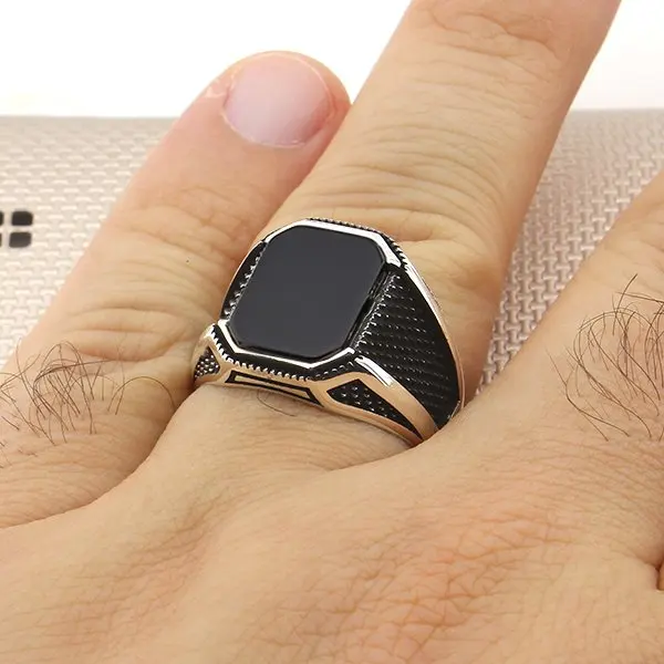 Окисленный прямоугольный черный оникс, мужское серебряное кольцо, тяжелый камень по месяцу рождения, Сделано в Турции, твердое искусственное серебро