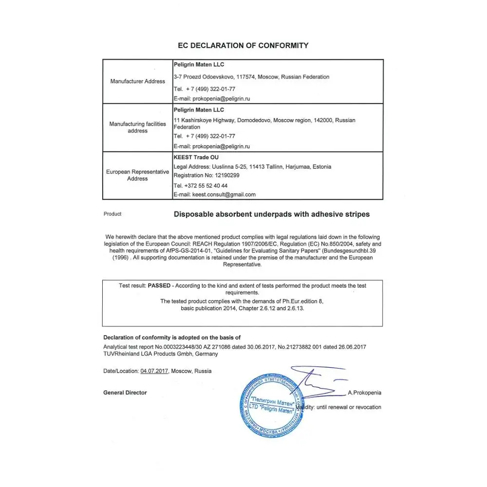 В пеленки серии "Сухая попка" добавлен суперабсорбент, превращающий жидкость в гель и позволяющий поверхности пеленки оставаться сухой, а значит, малышу будет комфортно находиться на ней. Все впитывающие пеленки, производимые компанией "Пелигрин Матен", прошли международную сертификацию (EC Declaration of conformity) и соответствуют европейским стандартам качества. Поверхность из высококачественного нетканого материала быстро проводит жидкость внутрь пеленки. Для впитывающего слоя используется только натуральная распушенная целлюлоза, отбеленная без использования хлора. Гранулы суперабсорбента, добавленные во впитывающий слой, помогают удержать еще больше влаги и превращают ее в гель. Полиэтиленовое основание предотвращает протекание жидкости и помогает надежно удержать влагу внутри. Пеленками удобно застилать кроватку малыша на ночь. Пригодятся в течение путешествий, поездок на машине, походов в гости или к врачу.