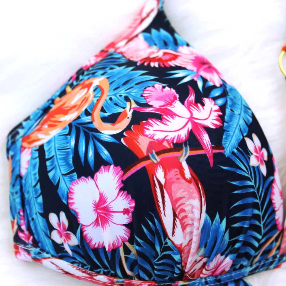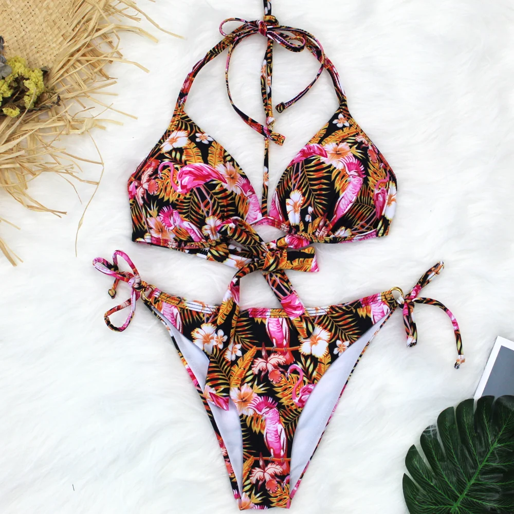 Женский черный купальник с фламинго, сексуальный бикини с пуш-ап, два предмета, купальник, летний пляжный купальник, треугольный купальник размера плюс, комплект бикини