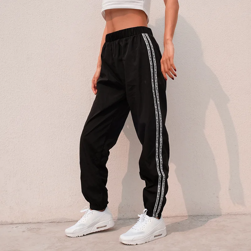 Женские спортивные штаны QWEEK для бега, уличная одежда, джоггеры с боковыми полосками, женские брюки, черные штаны с принтом в стиле Харадзюку и высокой талией, свободные брюки