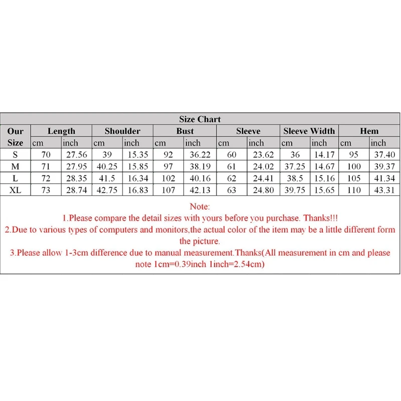 Размер: S Длина: 70 см (27,55 дюйма) плечо: 39 см (15,35 дюйма) бюст: 92 см (36,22 дюйма) рукав: 60 см (23,62 дюйма) Ширина рукава: 36 см (14,17 дюйма) подол: 95 см (37,40 дюйма)