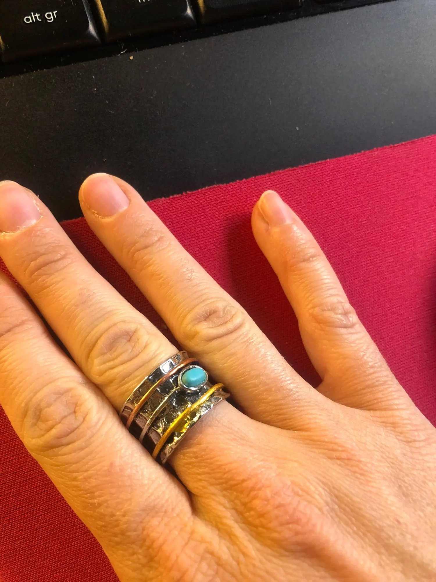Кольцо не так красиво, как в рекламе, золото и розовое золото на нем расписаны! Я не думаю, что эти цвета продолжатся. Галька имеет естественный вид, но это, вероятно, нет. Кольцо очень большое, учтите это при заказе. В целом, кольцо OK.-0