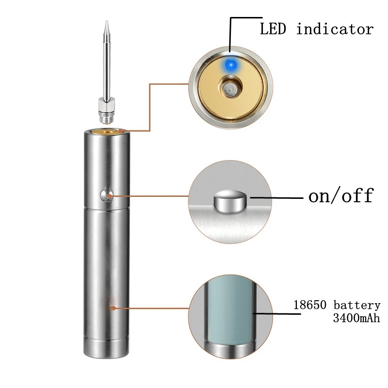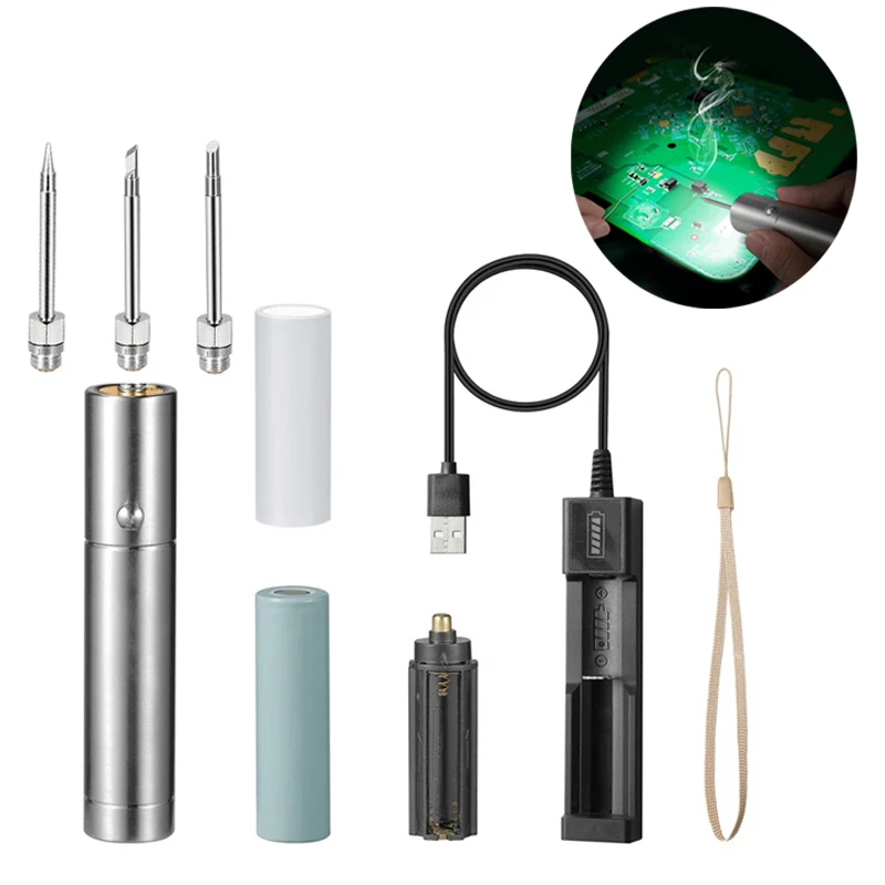 В целом паяльник зачётный. Из минусов - он гораздо крупнее, чем я ожидал, рассчитан на батарею 21700 (18650 стоит с переходником) и соответственно тяжёлый. Такое расположение кнопки неоднозначно, в сумке или коробке есть риск ложного срабатывания с вытекающими последствиями, поэтому батарею или жало лучше изымать. В остальном класс, провода не нужны, нагрев быстрый, несмотря на тонкие жала с маленькой площадью соприкосновения олово прогревается отлично. Взял этот, потому что на распродаже он был за 1180, но на алике есть и другие варианты, возможно интереснее, не знаю..