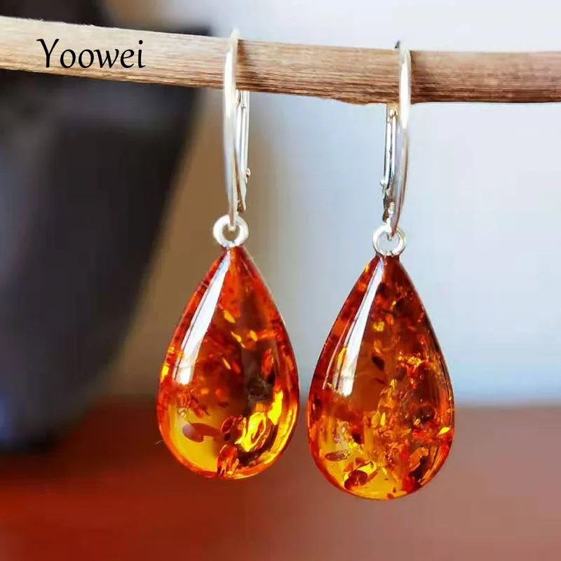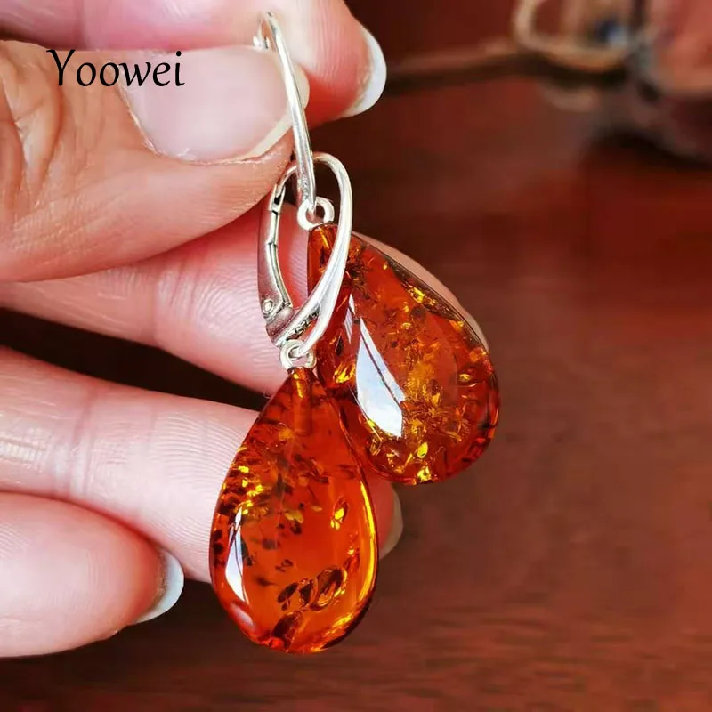 【Title】Yoowei 2021 Новые Натуральные янтарные серьги для женщин S925 серебро настоящий цветок коньяк Висячие Серьги Каплевидные Балтики янтарные ювелирные изделия оптом