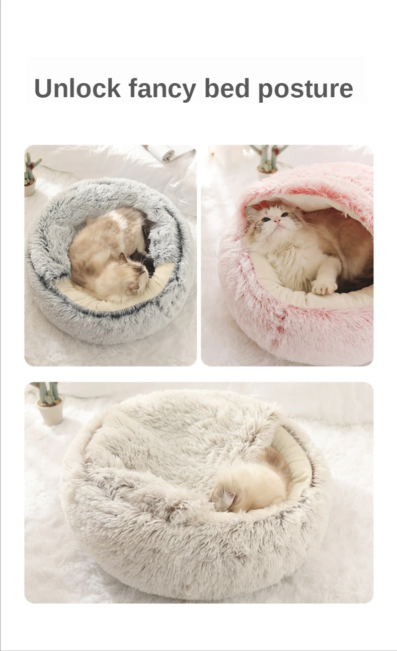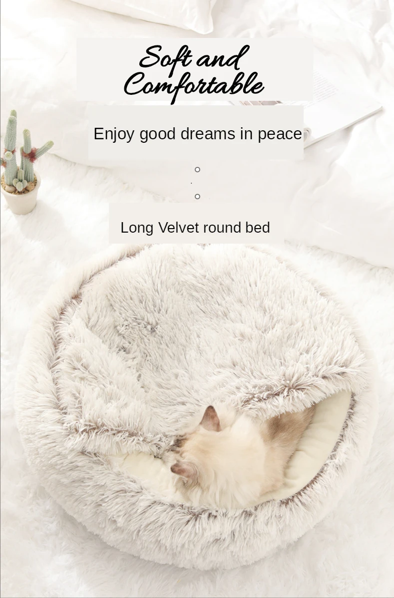 Новая зимняя кровать для кошек круглые плюшевые, теплая мягкая кровать, мягкая длинная плюшевая кровать для маленьких собак, гнездо для кошек, 2 в 1, кровать для кошек, спальный мешок для щенков