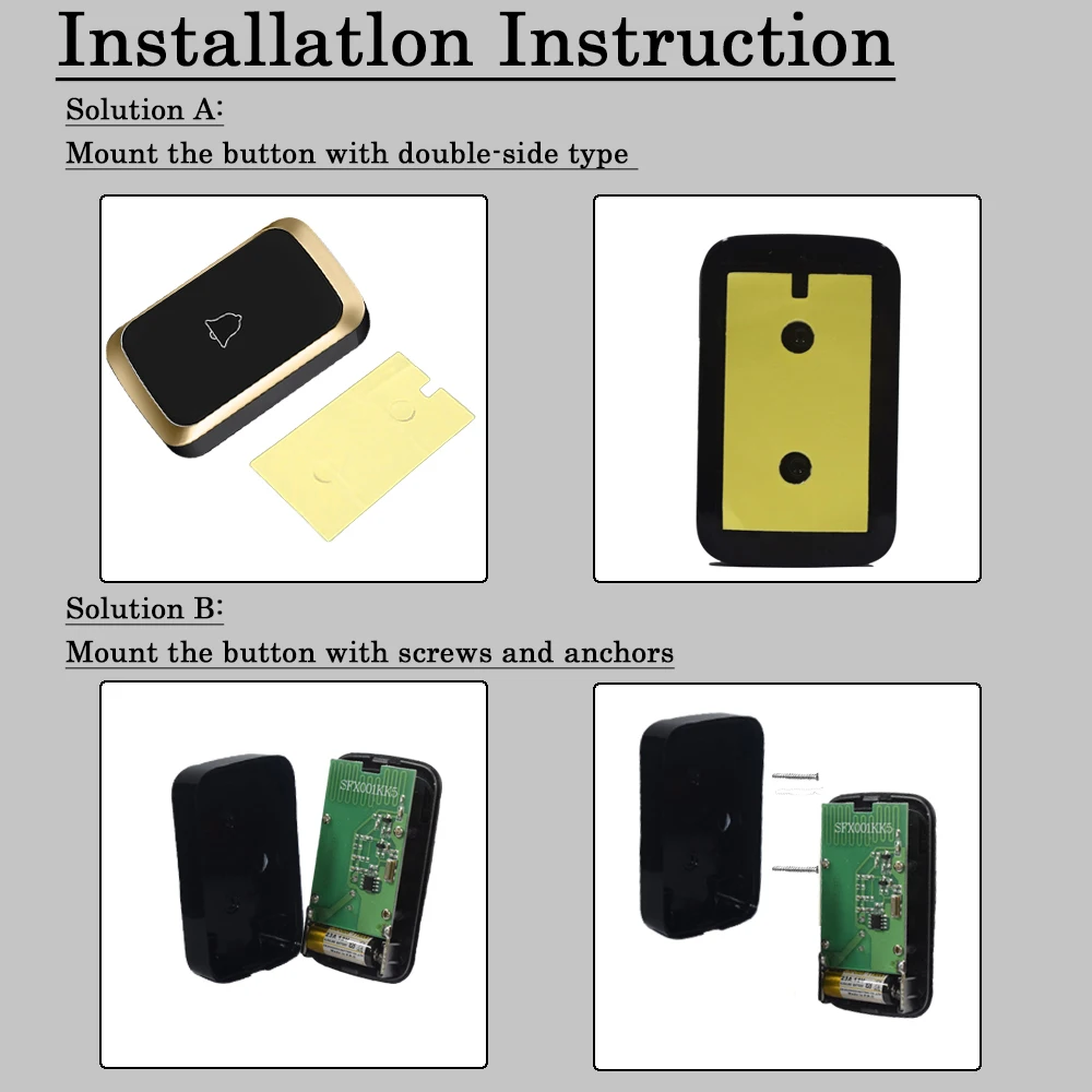 1. Кнопка поддерживает до 20 шт., а приемник поддерживает до 100 шт.2. Если несколько кнопок соединены с одним или несколькими приемниками в одной системе, каждая кнопка может быть установлена на другой мелодии звонка.3. Функция отключения памяти: Включите питание снова после выключения питания, не нужно повторно регулировать и блокировать мелодию звонка.4. Передатчик не имеет винтового патрона, он может быть водонепроницаемым и пыленепроницаемым без резинового кольца.5. Передатчик использует щелочную батарею 23A12V (не входит в комплект).6. Напряжение приемника: 110-220 В.7. Приемник доступен в различных вилках, штепсельных вилках США/ЕС/Великобритании и адаптерах Австралии, подходит для большинства стран.8. Расстояние приема: 300 метров на открытой местности.9. На беспроводной сигнал будут влиять препятствия. Чем больше препятствий, тем серьезнее потеря сигнала.10. Приемник имеет 4 уровня 20-80 дБ, 36 музыки на выбор.11. Размер: передатчик 77x46x20 мм, приемник 90x56x20 мм.Примечание: кнопка не может быть размещена на железной двери, потому что это будет мешать сигналу.