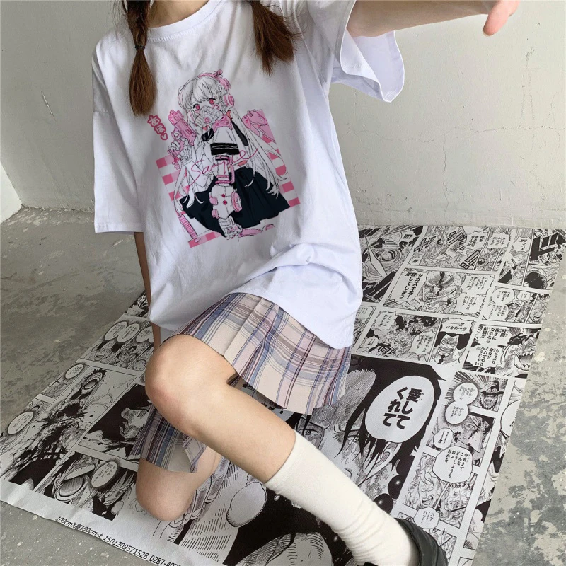 Розовый милый мультяшный милый женский японский уличный Топ Harajuku Y2K Kawaii Повседневный Топ Ulzzang Винтажный шик Свободный Женская летняя футболка