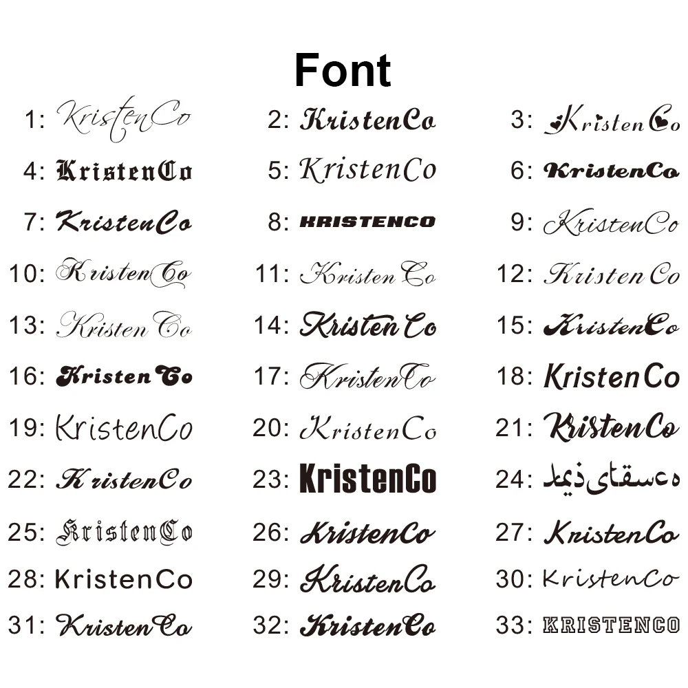 1. Дорогой, когда вы покупаете ювелирные изделия, вы должны оставить сообщение после заказа или отправить мне имя и шрифт, который вы хотите настроить (например, имя:Алиса, шрифт 2), Если вы только сообщите нам имя, но не имеете шрифт, мы подгоняем шрифт для вас в соответствии сШрифт по умолчанию. Если вы даже не сообщите нам свое имя, мы отправим товар по умолчанию. Когда вы думаете об этом, не волнуйтесь, вы все еще можете связаться с нами, и мы будем продолжать настраивать его для вас.