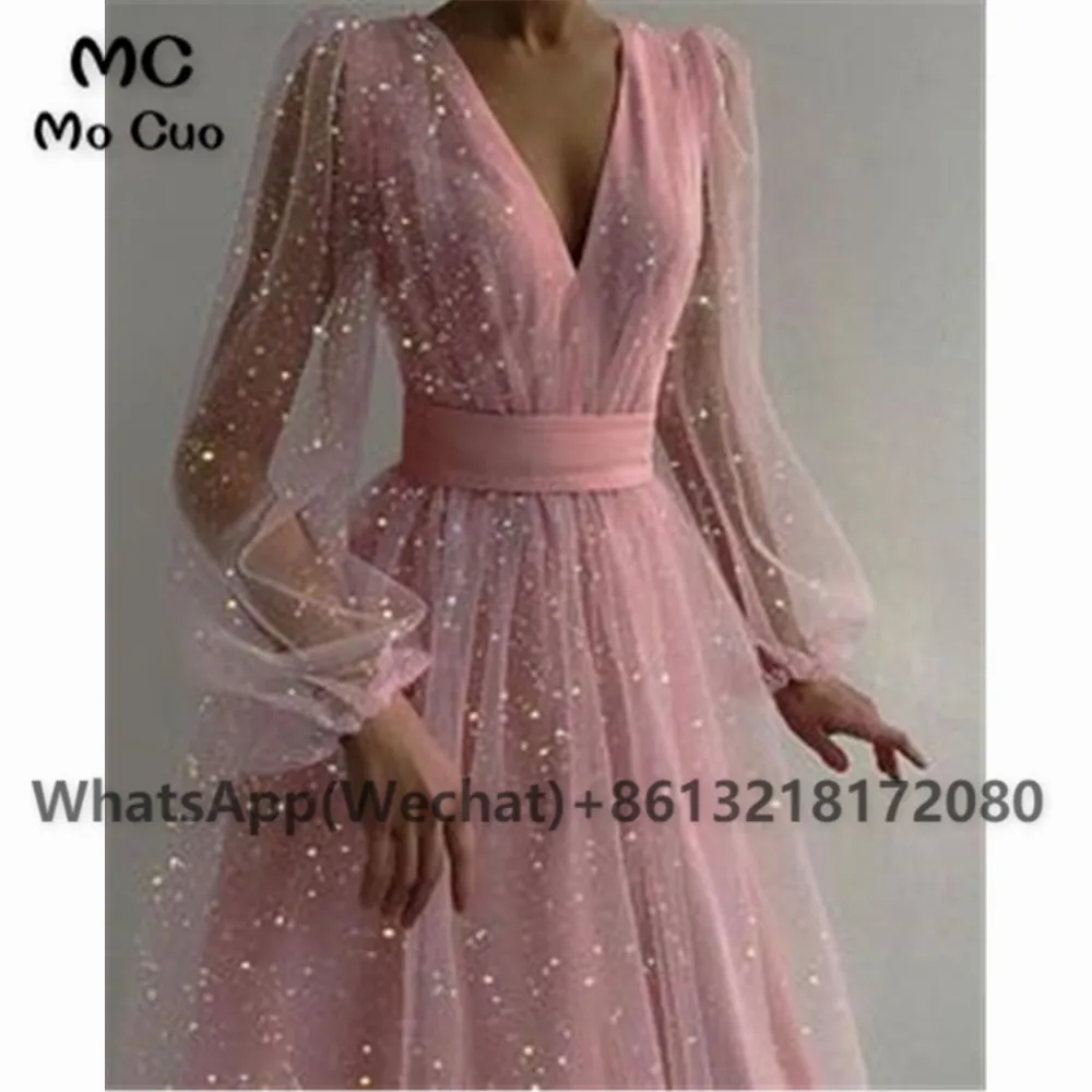 Новинка 2021, блестящее розовое вечернее платье для выпускного вечера с кружевами и длинными рукавами, выпускное платье из фатина для женщин
