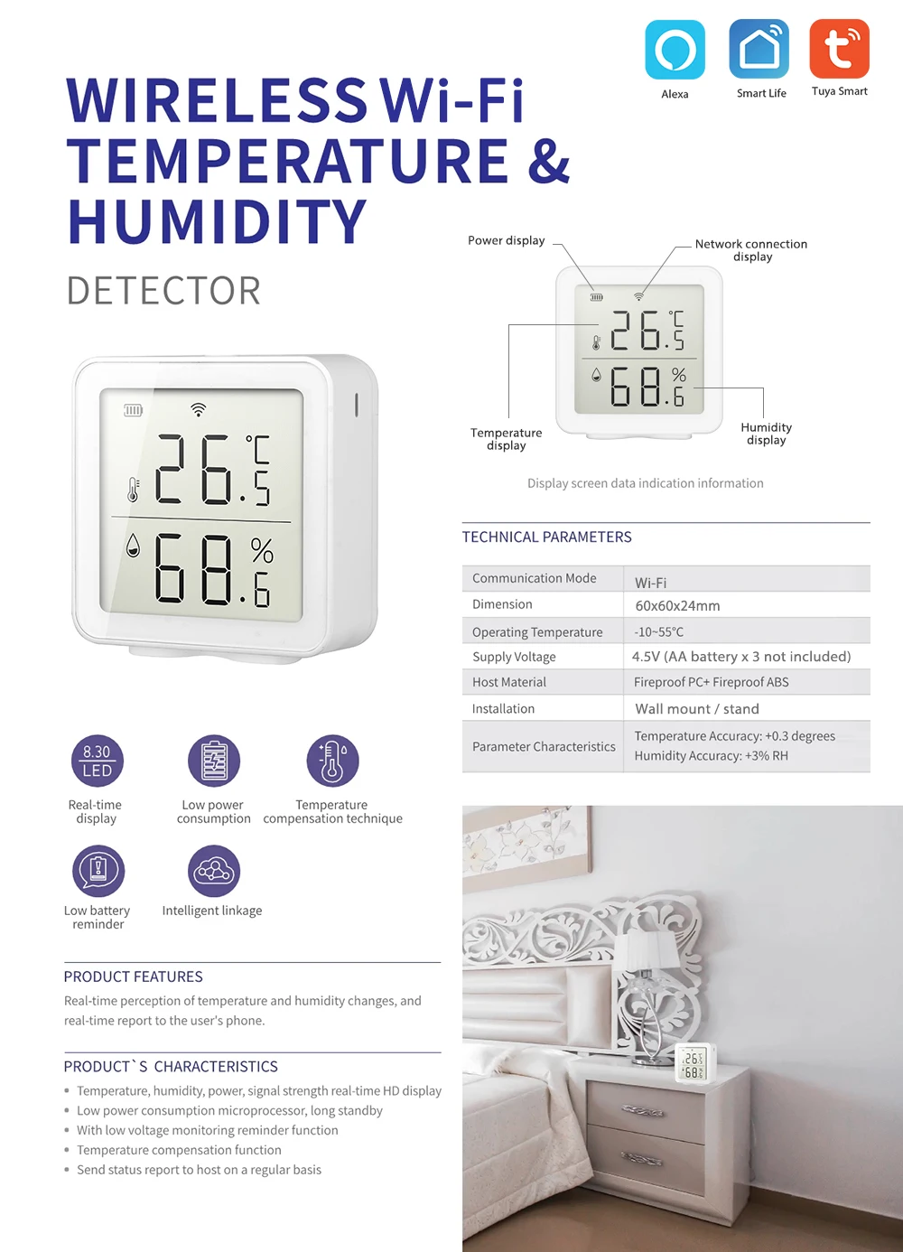 Используйте для обнаружения изменения температуры и влажности в окружающей среде. Он может отображать значение в реальном времени на экране устройства, а также обновлять данные в облаке и приложении для пользователей. Подходит для использования дома, банка, отеля и офиса