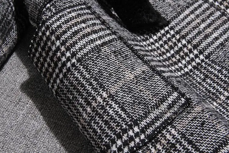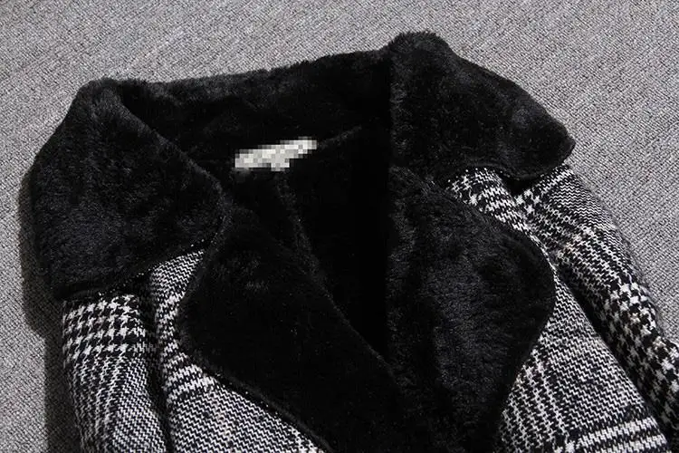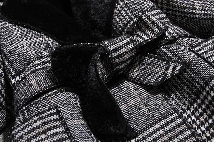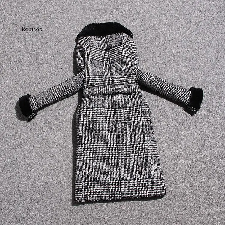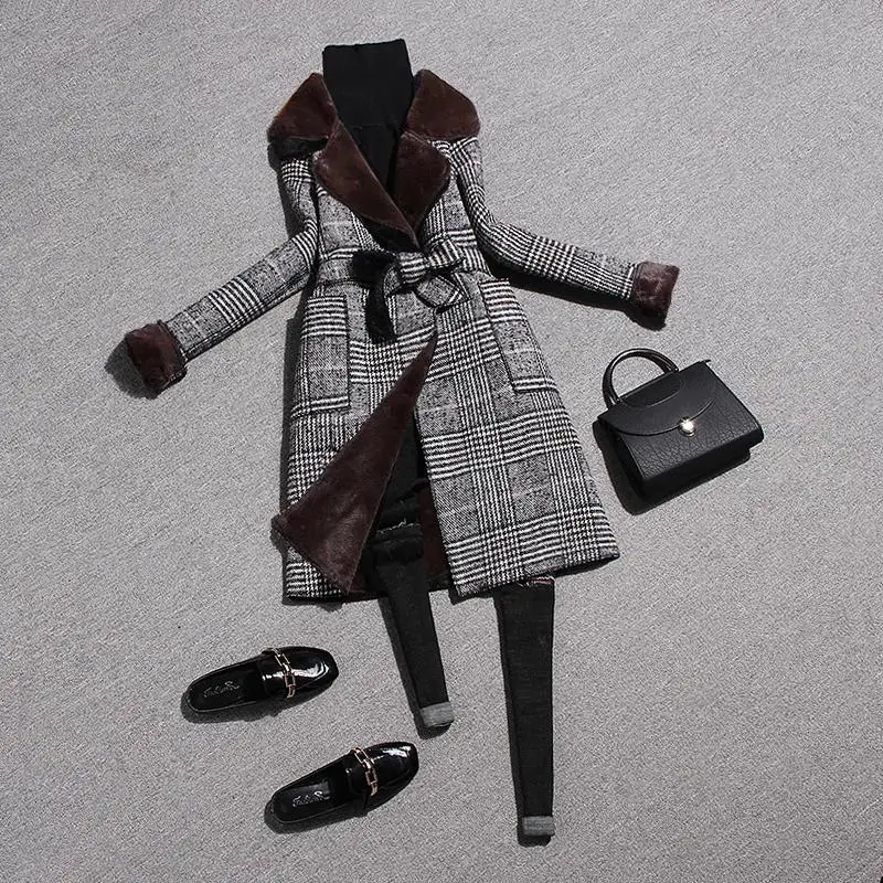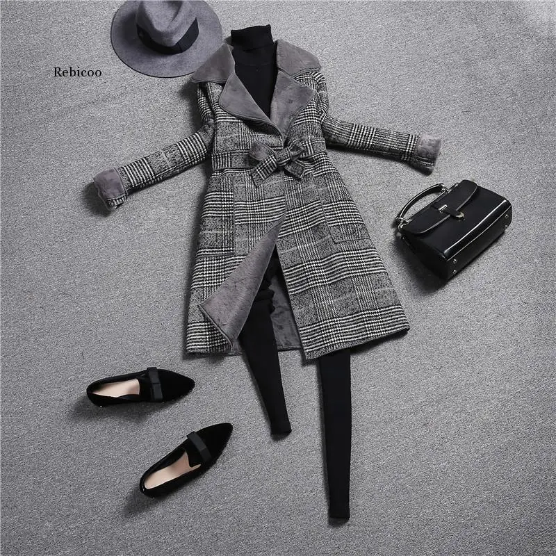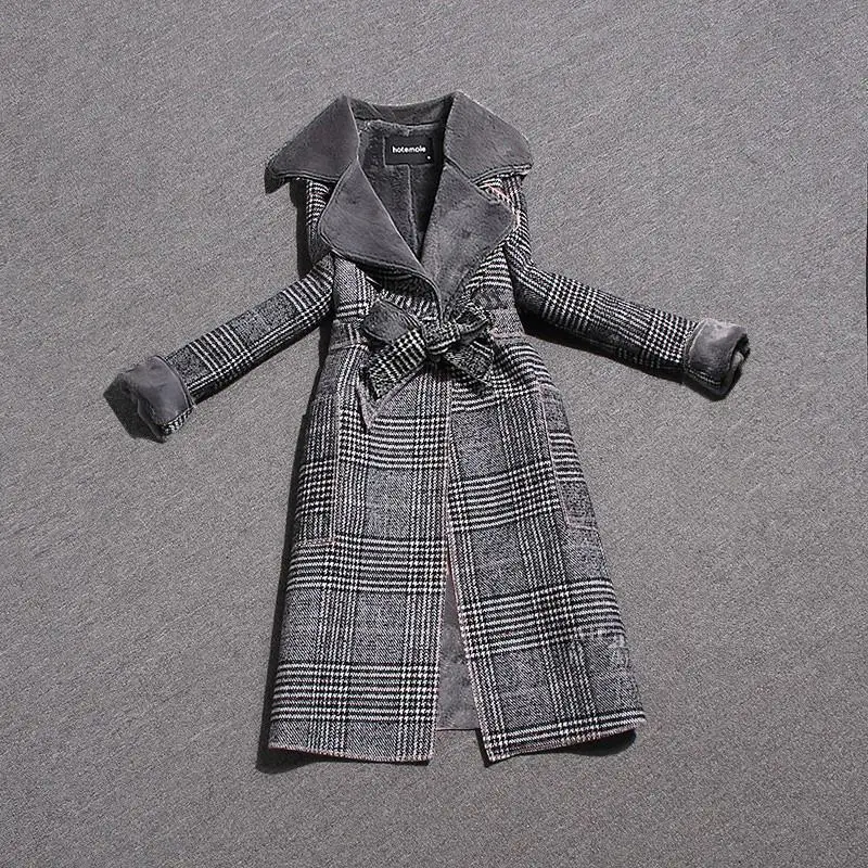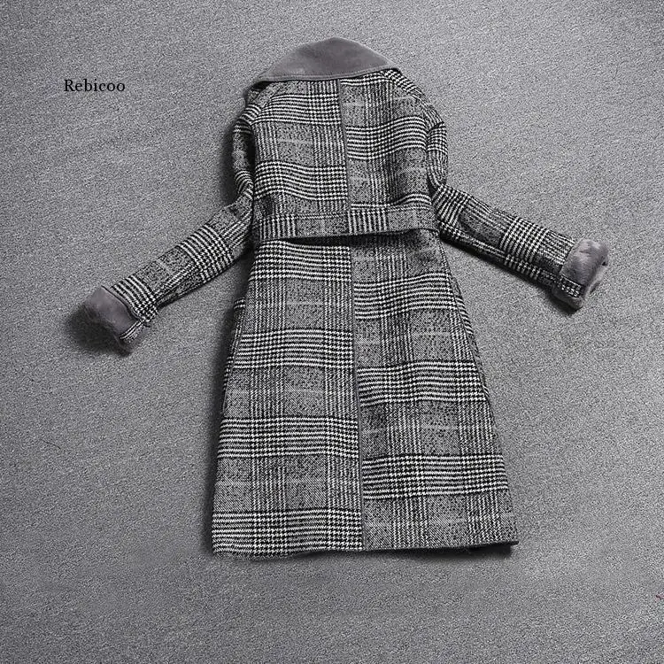 Женское шерстяное пальто в клетку, винтажное пальто с отложным воротником и поясом, теплая верхняя одежда в Корейском стиле из искусственной шерсти на осень и зиму