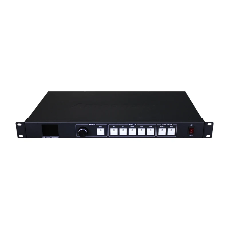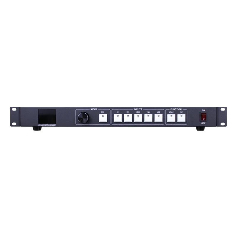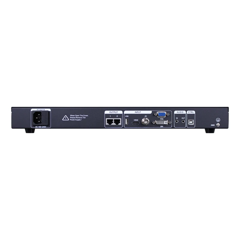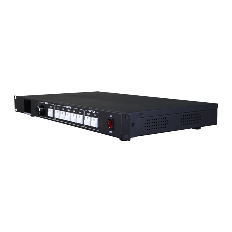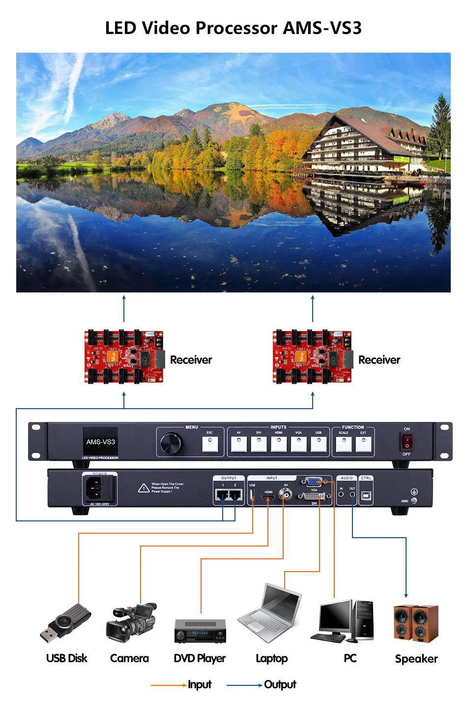 Multiple Video Input -- VS3 video controller uses 5 channels of video input, including 1 composite video AV (CVBS), 1 channel VGA, 1 channel DVI, 1 channel HDMI, 1 channel USB. Basically, the needs for civil and industrial use have been covered. Seamless switching of all video input. Support Audio Sync Output -- VS3 video controller has 1 HDMI channel audio input and 1 independent audio input, 2 channel choose one to output, the audio and video synchronized output. Gigabit Network Port --VS3 video controller range is 1.3 million pixels,has 2 ports, every port each up to 650,000 pixels, maximum width:3840, maximum height:1920; if you used other brand receiving cards, some parameters may be limited; Compatible Receiving Cards --HD/AMS (Recommended);LXY/ CLT (some parameters may be limited); Seamless Switching -- VS3 video controller can also seamlessly switch between any channels switching, According to the demand, any input signal source can be selected to switch on the screen. Mode Save And Recall -- VS3 video controller user presets with 7 groups, mode can store all user default setup parameters, Can achieve rapid field parameter backup and recall function (need to enter menu enable Signal Detection -- VS3 video controller will detect automatically whether the signal input or not when the corresponding inputs connected , if the current channel has signal input, the signal channel led indicator light is normally on and LCD screen will show the signal source type and the resolution ;If the current channel has no signal or signal unnormal, the signal channel led indicator light will flashing, LCD screen shows no signal. Display Test Function -- Through LCD screen interface and knob, can select multiple modes of led display test. USB Play -- Playing video files and picture files in USB storage, supporting video within 720p, compatible with common video formats.
