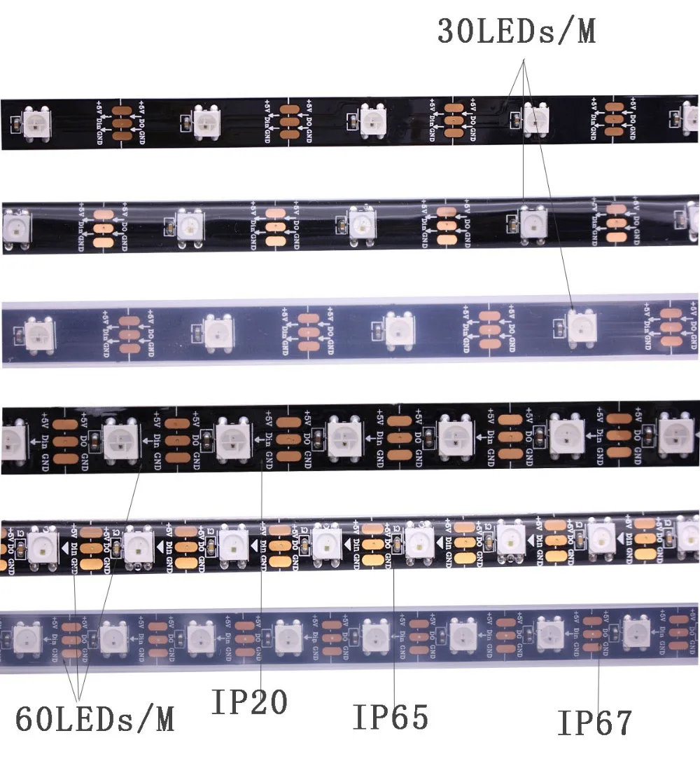 1. Входное напряжение: DC5V 2. Мощность: 9 Вт/метр (30 светодиодов/м) 18 Вт/метр (60 светодиодов/м) 43,2 Вт/метр (144 светодиодов/м) 3. Светодиодный ресурс: WS2812B светодиодный (5050 SMD RGB светодиодный со встроенной улучшенной версией ws2811 ic) 4. Светодиодный: Каждый светодиодный Светодиодный 5. Тип IC: улучшенная версия ws2812 IC (встроенный светодиод 5050 smd rgb) 6. IC: (1 IC дисков 1 led чип) 7. Пиксели: 30/60/144/метр 8. Шаг: 16,6 мм (1000/64) 9. Серые Весы: 256 10. Биты/Цвет: 8 бит/цвет 11.FPC размер: Ширина: 10 мм, высота: 2,5 мм 12.FPC Цвет: черный/белый 13. Степень защиты: IP30/IP67 14. Цвета:. Полноцветный RGB, изменение цвета мечты 15. Можно резать: Каждый светодиодный 16. Посылка: в антистатическом пакете