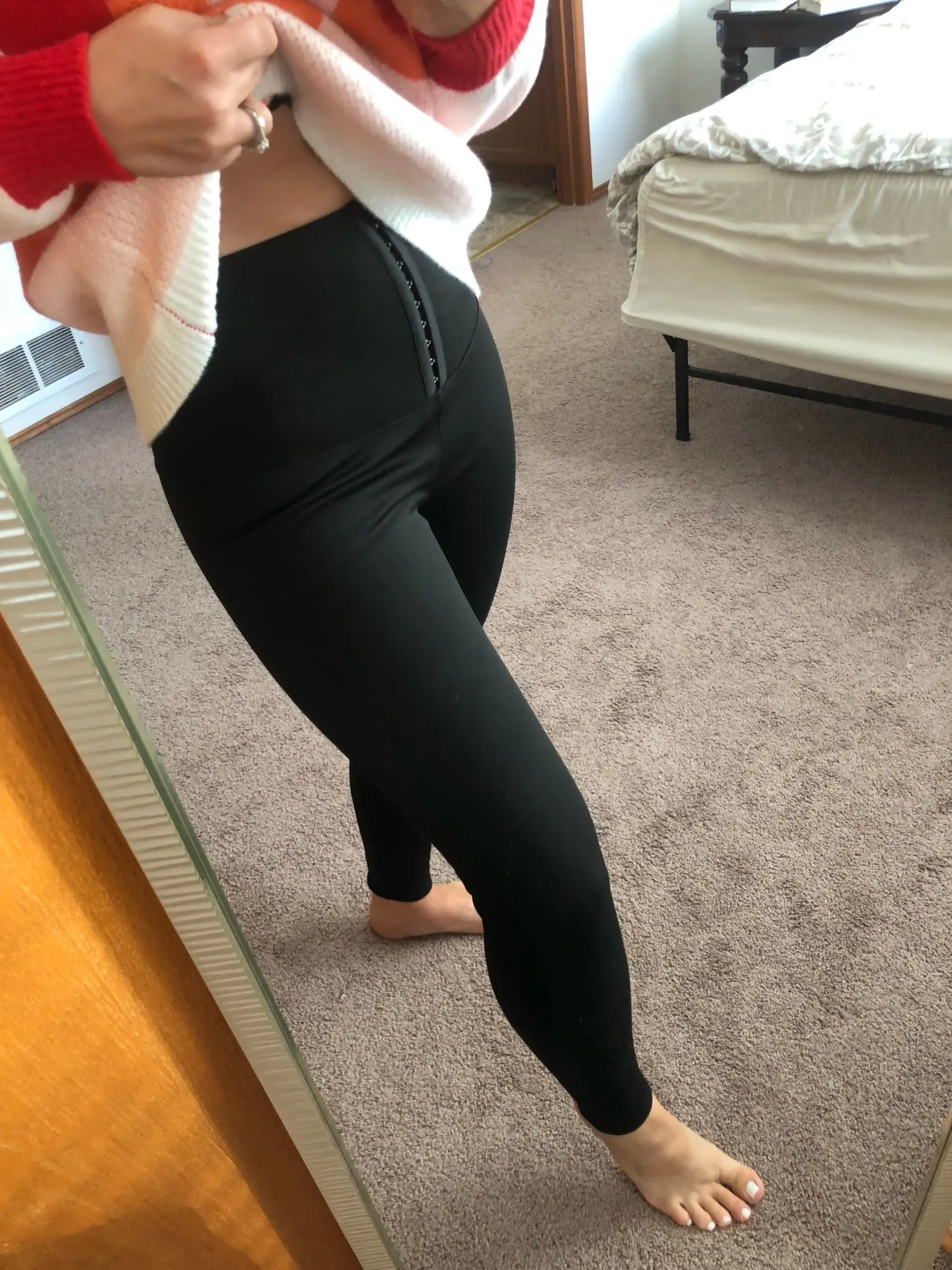 Леггинсы плотные, хорошо моделируют фигуру. Посадка высокая, в поясе имеется три ряда крючков для регулировки. На мне размер L, на талию 70 см подходит самый дальний ряд крючков. Длина полная на рост 165 см, есть небольшой запас.