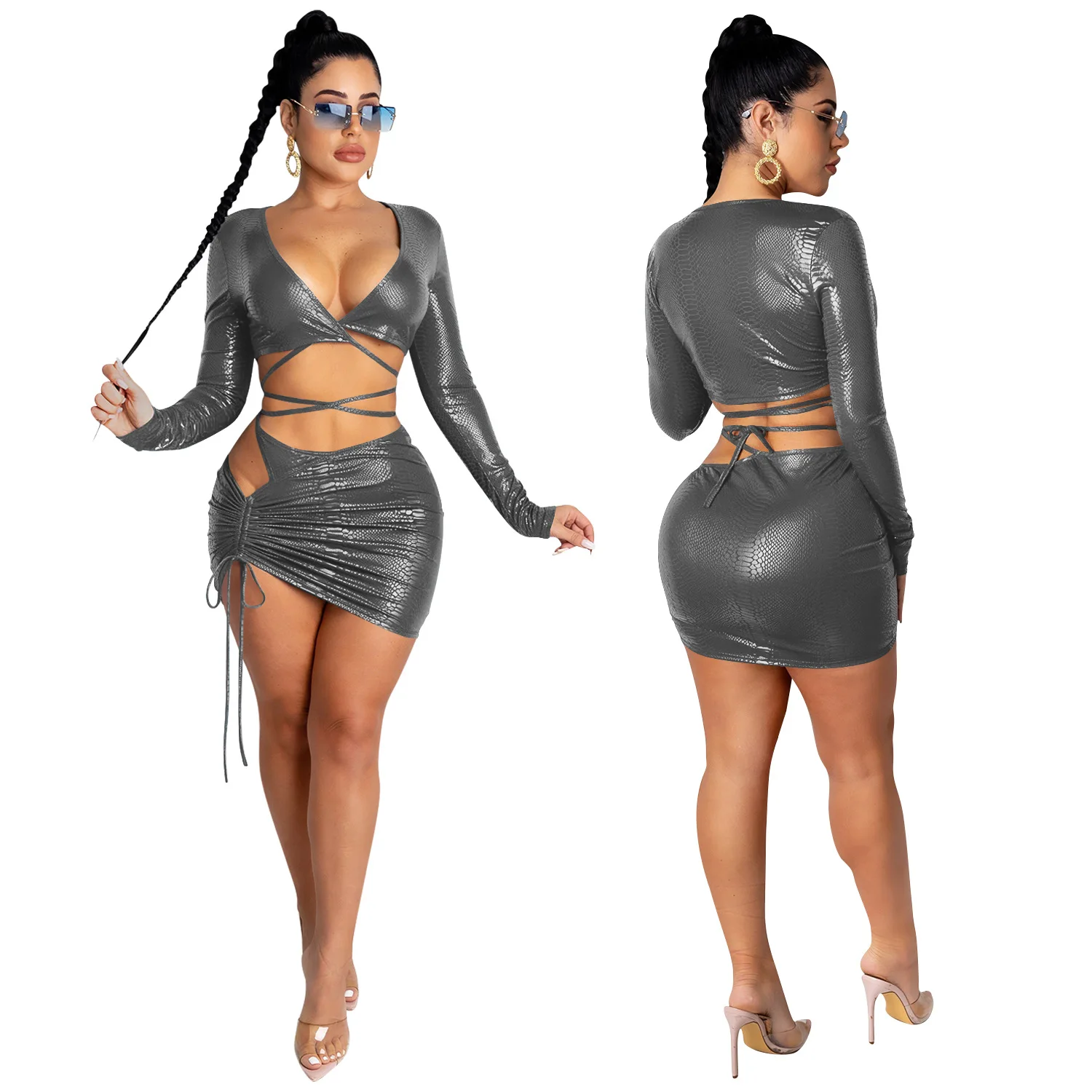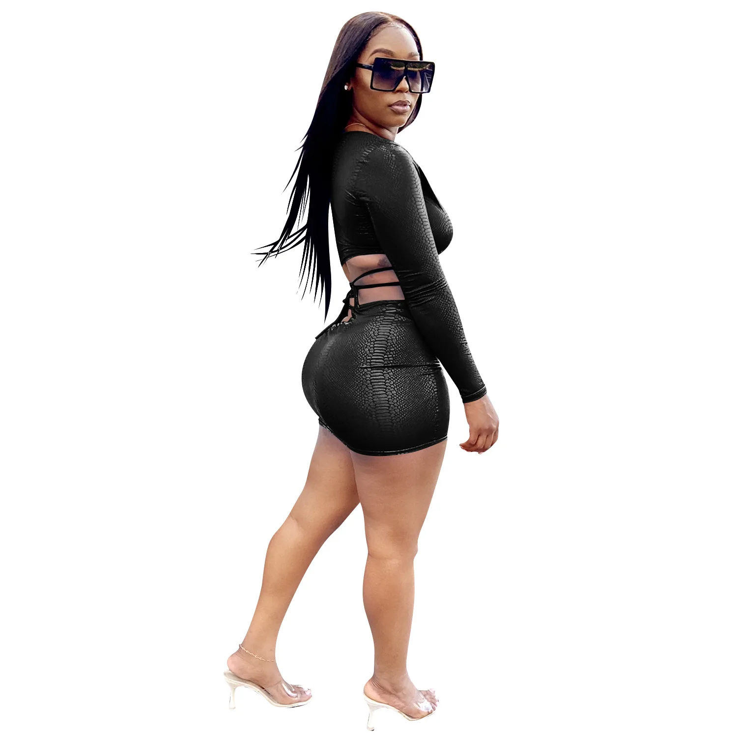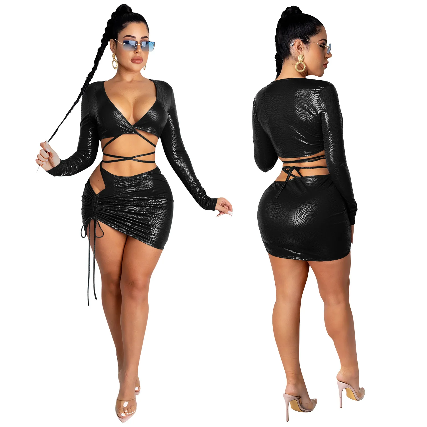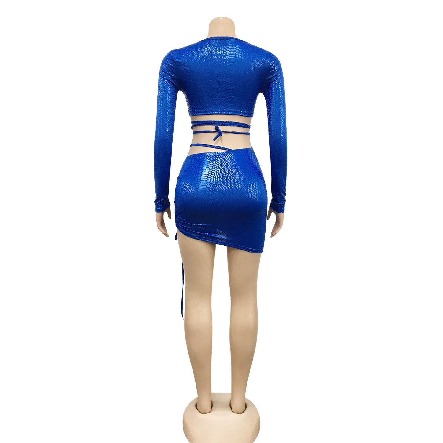 Женский костюм с длинным рукавом Cutubly, осенне-зимний комплект из двух предметов, сексуальный костюм из змеиной кожи, топ с вырезами, мини-юбка, клубный спортивный костюм