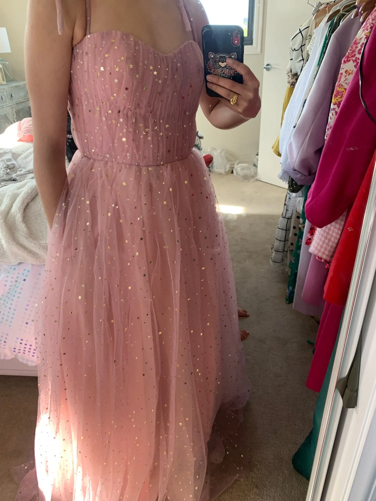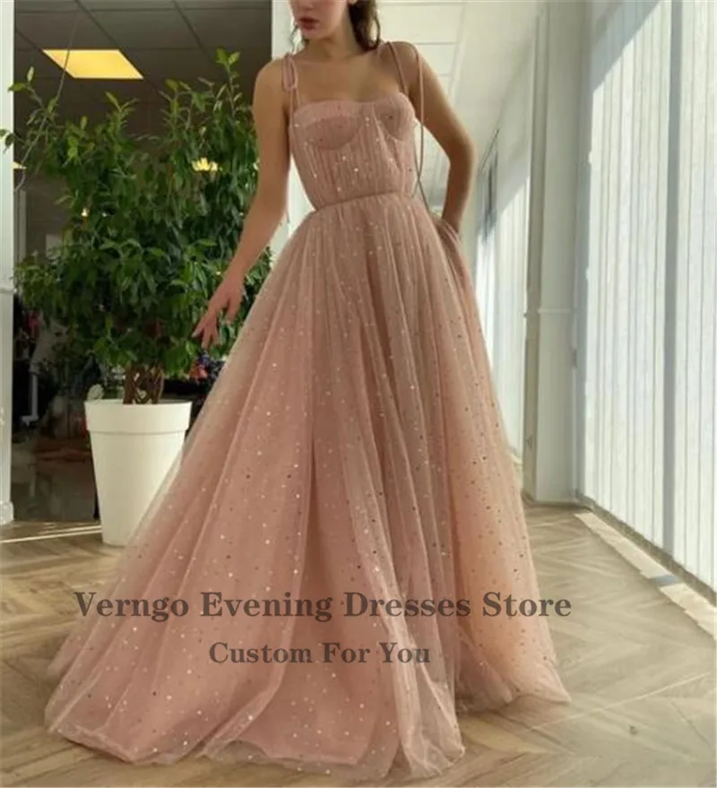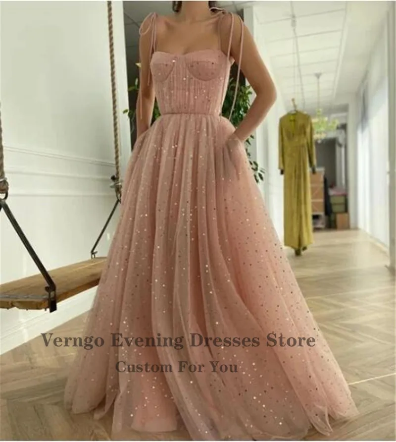 Вечернее платье для выпускного вечера, из тюля, с золотыми звездами, на тонких бретелях, с завязками, с бантом, с карманами, с рюшами