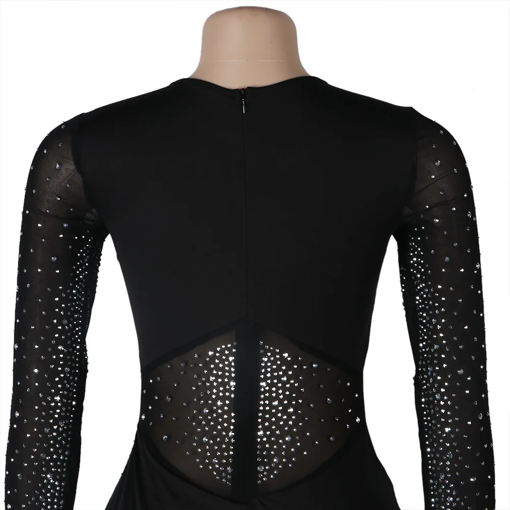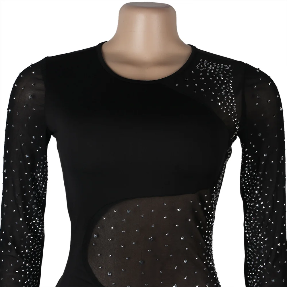 Прозрачный сетчатый стразы, прозрачный тонкий комбинезон, женский комбинезон с круглым вырезом и длинным рукавом, комбинезон для клувечерние, элегантные черные облегающие комбинезоны