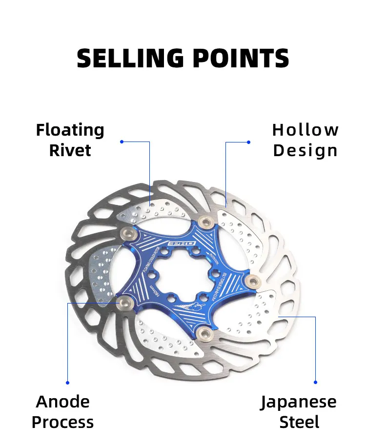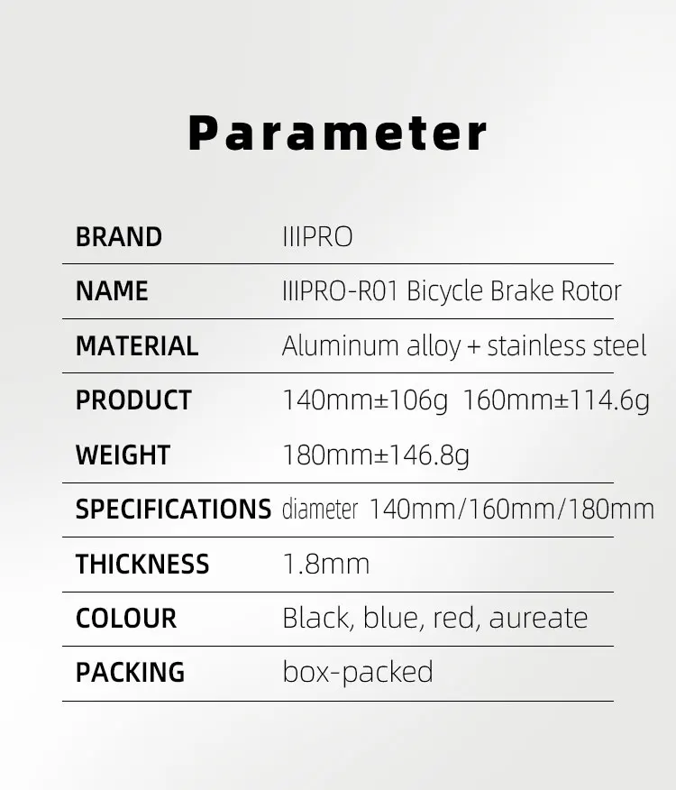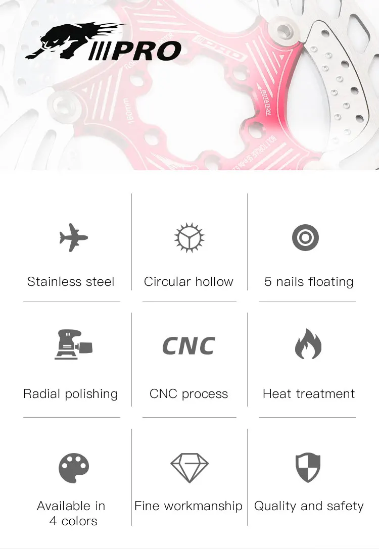 Название: плавающий ротор дискового тормоза для велосипедаМодель: IIIPRO 5 гвоздейМатериал: алюминиевый сердечник с ЧПУ + нержавеющая сталь + радиатор с алюминиевым крыломРазмер: 160 мм/180 мм (160 мм для горных велосипедов)Тип: шестигвоздовый диск международного стандарта (Расстояние между центрами двух отверстий составляет 44 мм)Применение: Горный/дорожный велосипедФункция: отвод теплаТолщина: 1,8 ммЦвет: черный/синий/золотой/красныйВес: 160 мм-115,8 г/180 мм-146,4 гПроисхождение: Тайвань Особенности:1. Использование алюминиевого сплава 7075-это высокопрочный холоднокованый алюминиевый сплав, который намного лучше мягкой стали.2. Общая коррозионная стойкость, хорошие механические свойства и реакция анода3. Радиатор с алюминиевым крылом обеспечивает улучшенный эффект рассеивания тепла