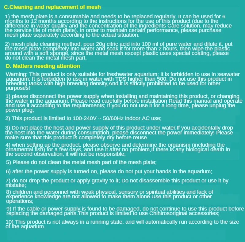 1. Продукт может использоваться только в пресной воде, TDS воды не может быть более 500, не может использоваться в морской/морской воде или высокоплотных селекционных резервуарах.