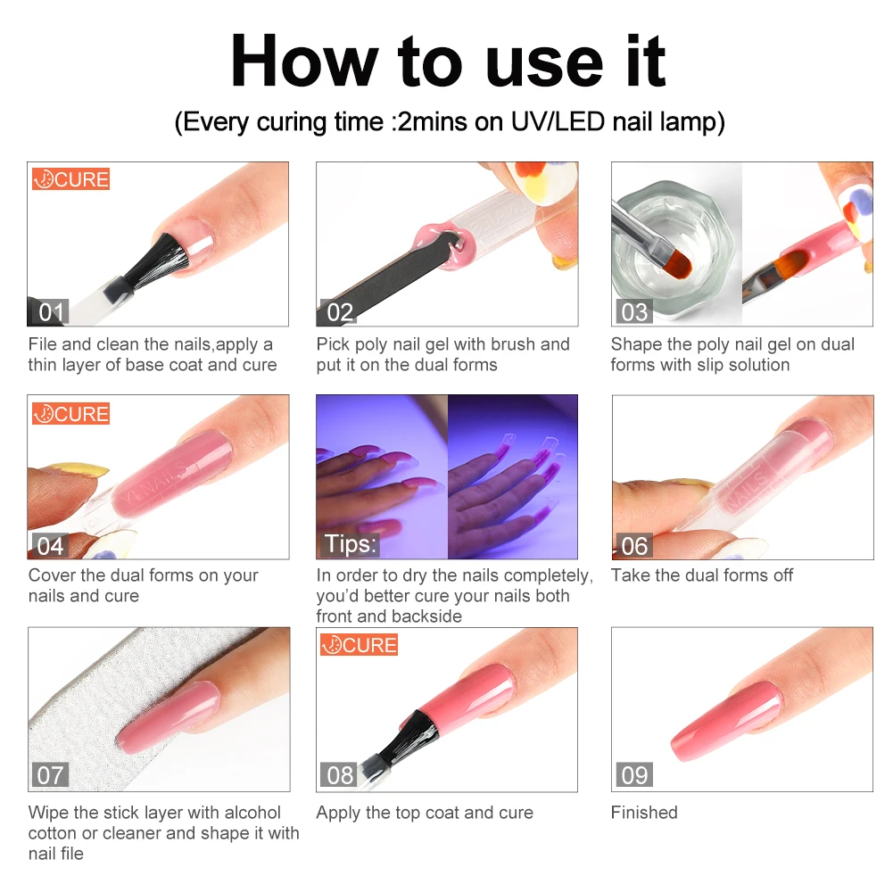 -Необходимо использовать полигель для ногтей моющее средство/раствор для скольжения, полигель для ногтей может быть выбран и сформирован на двойной форме гладко, предотвращая прилипание геля к кисти или другим полигелевым инструментам для ногтей.-Полигель для ногтей очень толстый, что легко придать форму и цвет, и вам нужно начать снизу и нажать на него вперед.