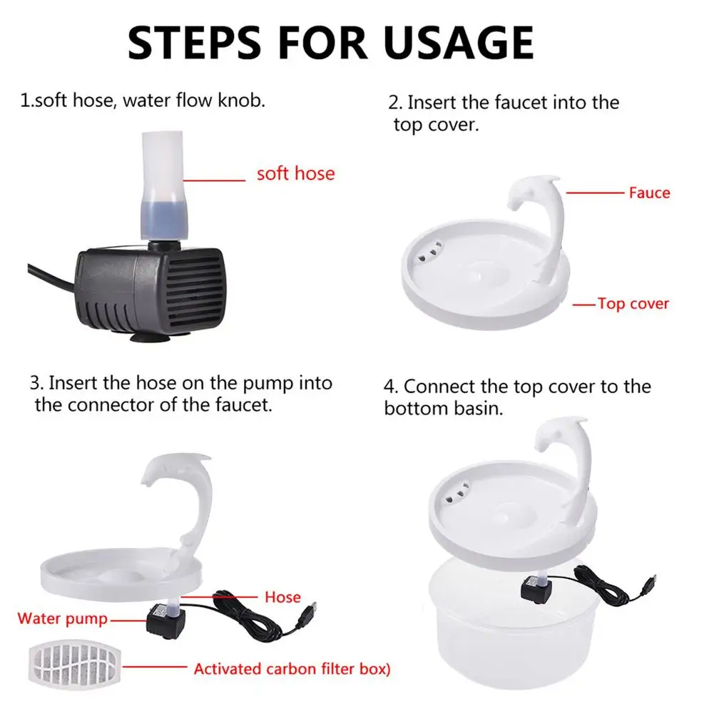 Точки пули:1. Фонтан для живой весенней воды: реалистичная форма дельфина, фонтан, имитирующий поток крана, очаровывает животных, не пугается и стимулирует домашних животных пить больше воды2. Функция обновления: из-за нехватки воды и отключения питания, высокого качества водяного насоса, когда диспенсер воды не хватает воды, автоматически выключается, напомните владельцу, чтобы добавить воду вовремя, чтобы обеспечить безопасность.3. Высокоэффективная система фильтрации: многократная очистка s может очищать и смягчать воду, фильтруя волосы, осадки и примеси, чтобы получить больше кислорода и свежести.4. Легко чистить: кошачий фонтан изготовлен из высококачественного АБС-пластика и полипропилена, а прозрачная коробка легко разбирается и моется, позволяет наблюдать за объемом наполняемой воды в любое время.5. Сверхтихая работа: не нужно беспокоиться о беспокойстве вас и вашего питомца.