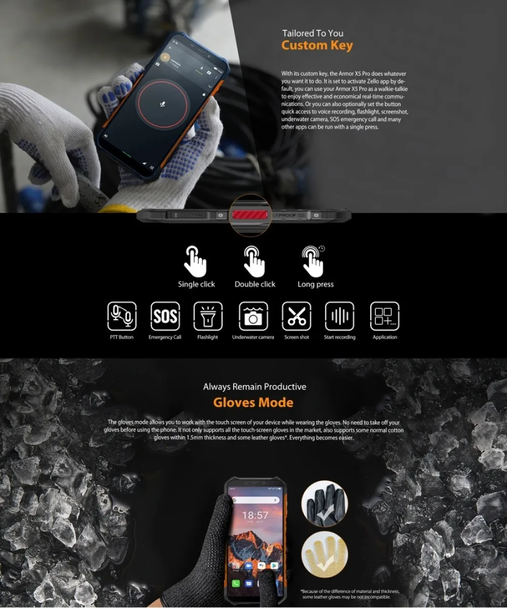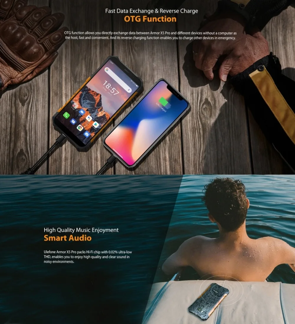 Особенности1. Восьмиядерный процессор MTK6762V/WD 64-бит до 1,8 ГГц, хорошая производительность, быстрая работа и бесперебойная работа.2. 5,5 дюймовый дисплей с соотношением 18:9, маленький корпус, большой обзор, 1440x720 пикселей, высокая четкость, яркие цвета, подходит для просмотра видео, игр.3. Круглая защита на 360 градусов, прочная и долговечная в использовании.4. Степень водонепроницаемости IP68/IP69K, Пыленепроницаемость, ударопрочность, его можно использовать в широких сценариях использования и применении.5. Питание от литий-полимерного аккумулятора высокой емкости 5000 в 4,4 мАч, длительный срок службы.Сеть1. Частота сети 2G:-GSM: B2/B3/B5/B82. Частота сети 3г:-WCDMA: B1/B2/B4/B5/B83. Частота сети 4G:-LTE-FDD: B1/B2/B3/B4/B5/B7/B8/B12/B17/B19/B20/B28A/B28B4. Поддержка VoLTE: Можно ли использовать VoLTE, зависит от местных перевозчиков, потому что не все местные Перевозчики могут поддерживать эту функцию.