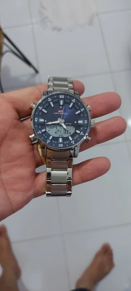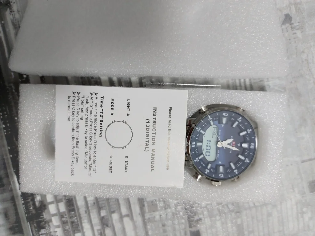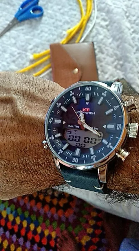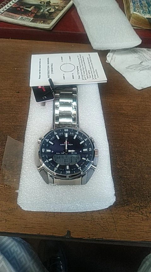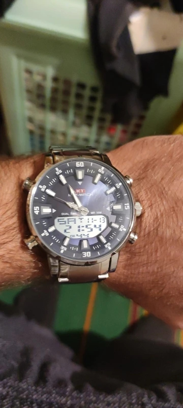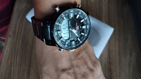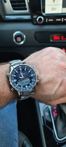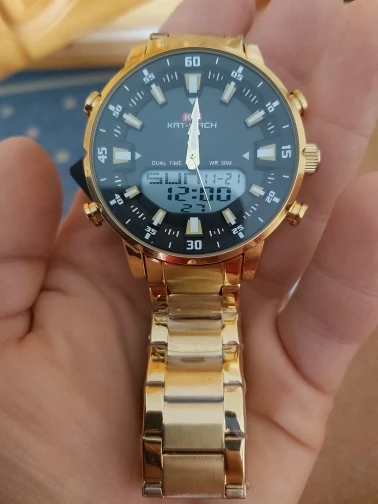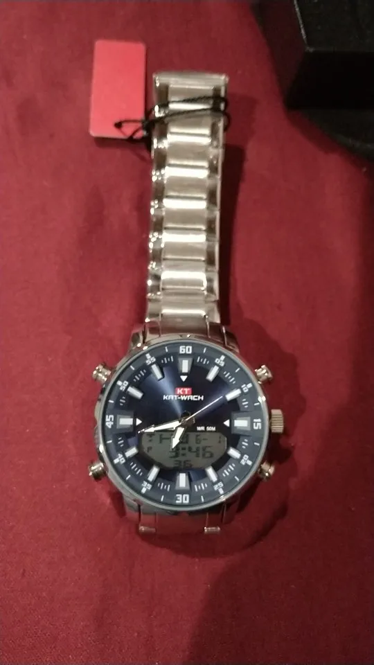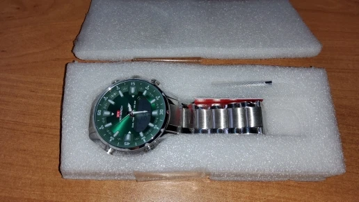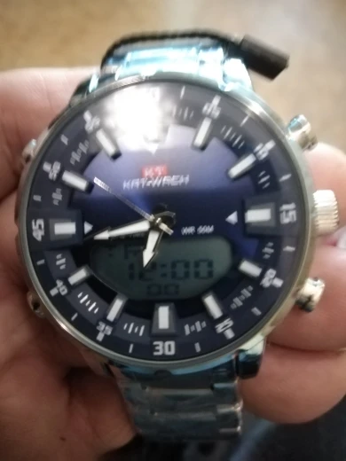 Часы очень красивые, на руке смотрятся хорошо, пишут что они большие-нормальные мужские часы. Продавец положил в подарок приспособление для регулировки браслета, пишут что он гнётся всё нормально делается и легко, просто штырьки надо выбивать по направлении стрелочки на браслете. За 3 дня эксплуатации кварцевые часы идут точно, а электронные отстали на 3 секунды. Деления на циферблате не все совпадают, но при наличии сдвоенных часов думаю это не критично. Доставка до Барнаула 31 день, было бы быстрее на10 дней если бы не косяки Новосибирского и Барнаульского МСЦ. Товар и продавца рекомендую.