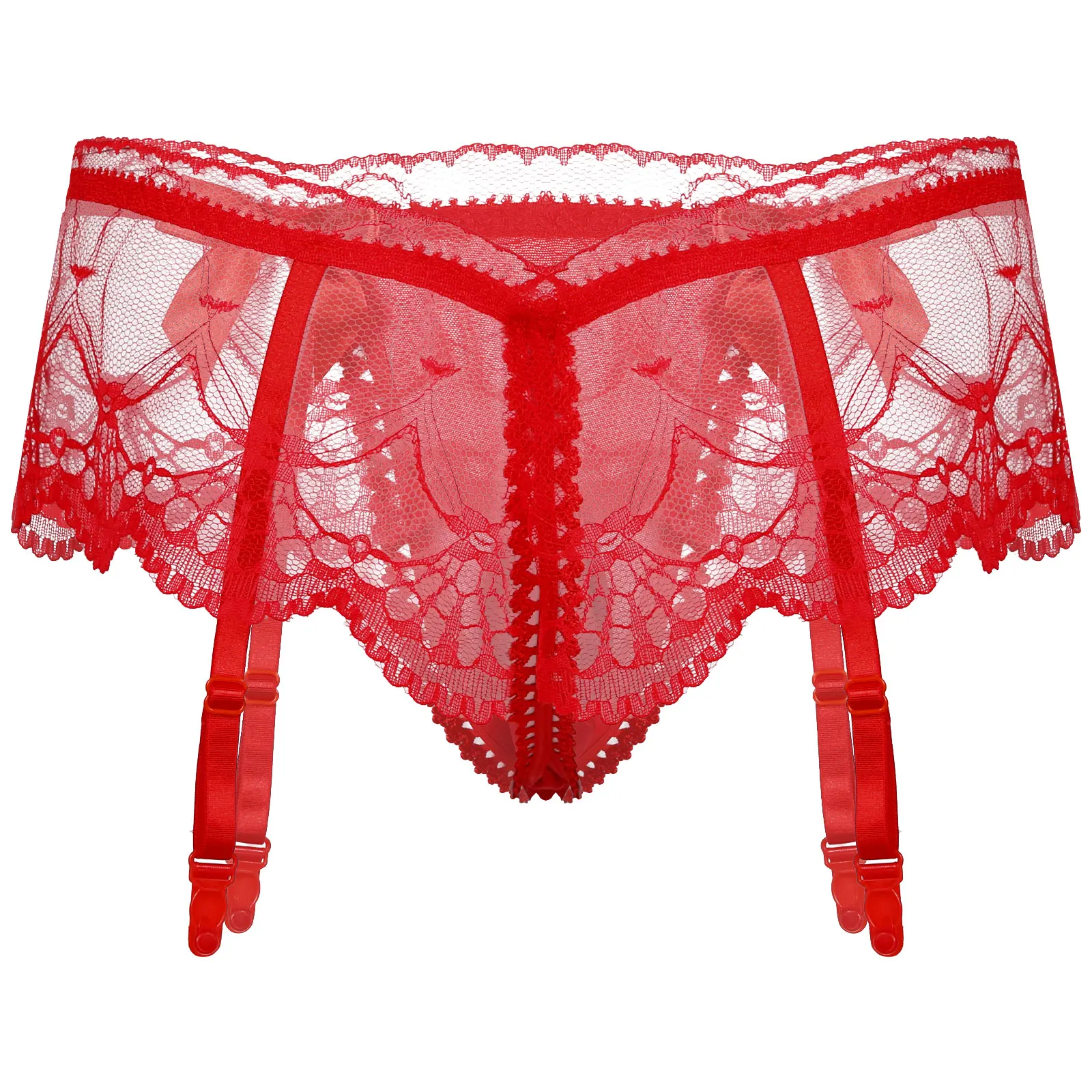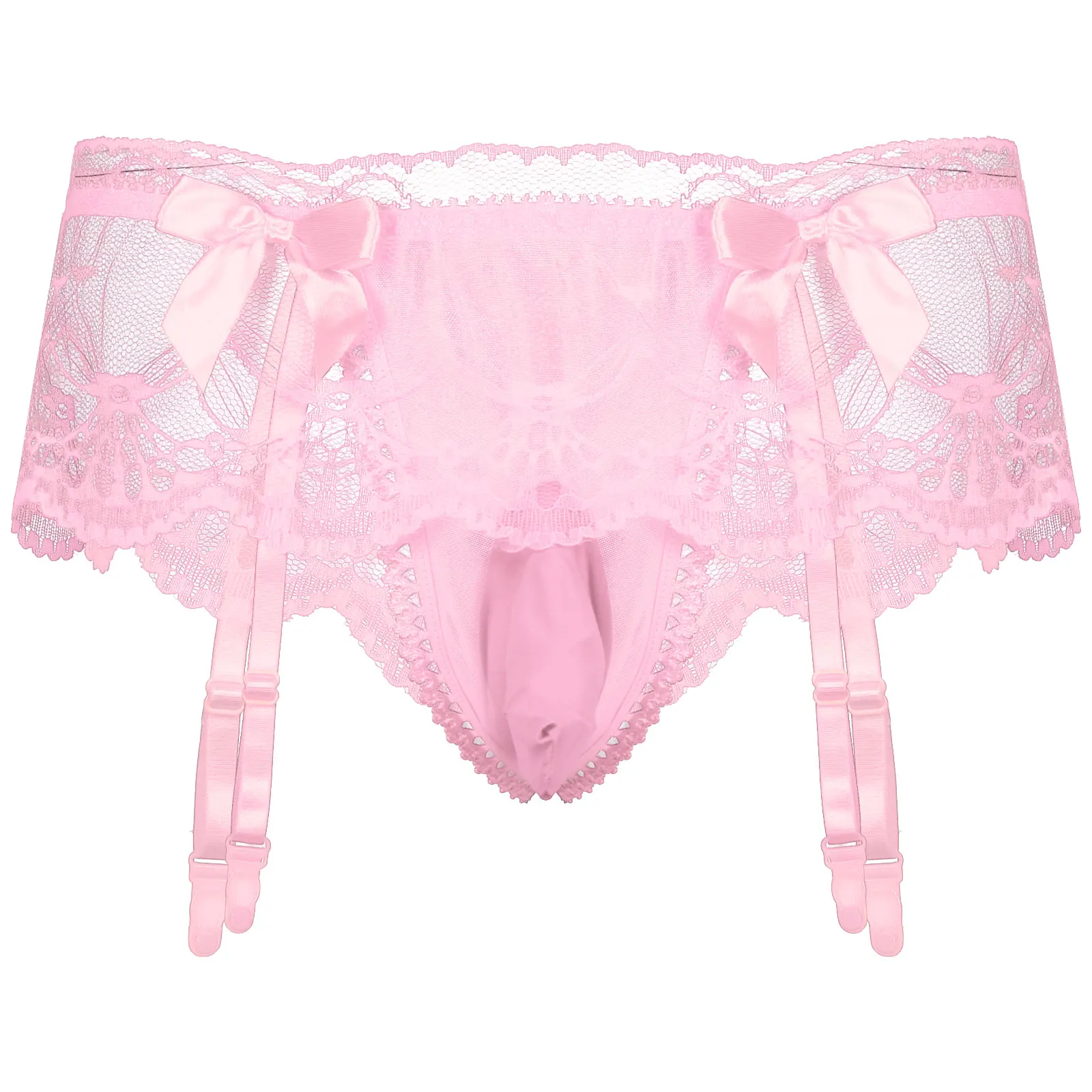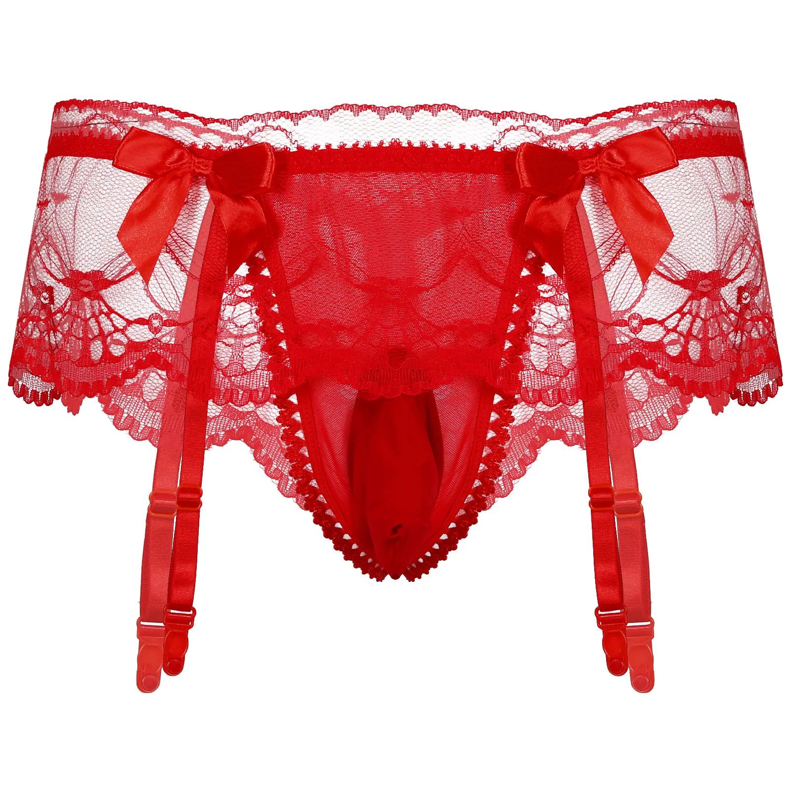 Особенности: Мужские Сексуальные трусы с Т-образной спинкой. Кружевной Край, украшенный двумя маленькими бантиками спереди. Каждая из них имеет четыре эластичных ремня с пластиковыми зажимами на талии, которые могут сжимать носки. Дизайн с низкой талией, эластичный пояс с выпуклой сумкой, легко и удобно носить. Отлично подходит для ночного нижнего белья, молодого настроения, удовольствия для себя, хороший подарок для вашего возлюбленного.