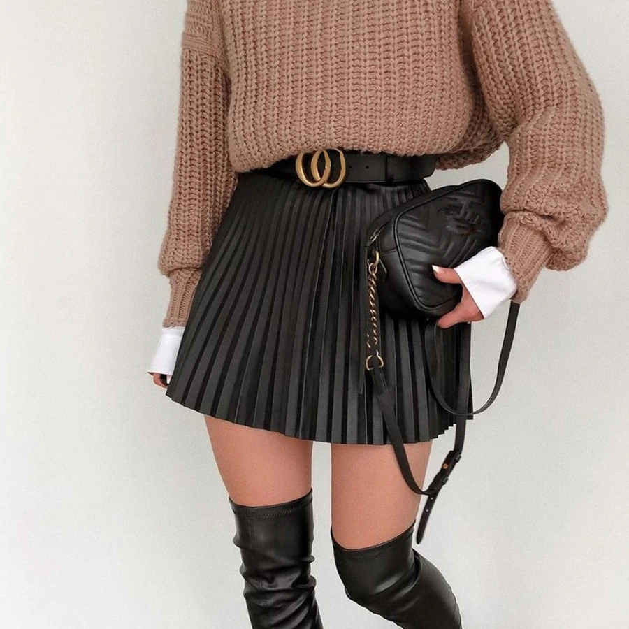 Женская короткая юбка из искусственной кожи, черная трапециевидная Уличная Сексуальная мини-юбка с высокой талией, плиссированная юбка для женщин на осень и зиму
