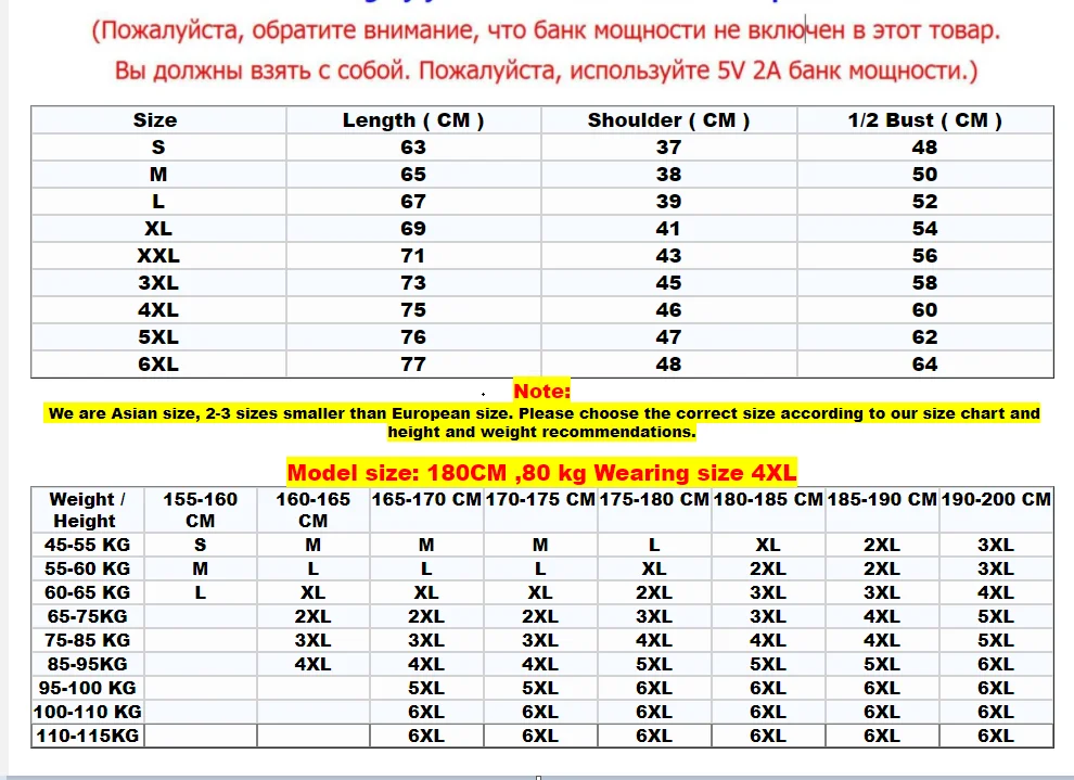 1. Стиль: жилет без рукавов 2 Материал: полиэстер 3. Цвет: черный/синий/красный 4. Размер: S/M/L/XL/2XL/3XL/4XL Grootte Lengte Buste Schouder Hals Размер; Длина; Обхват груди; Плечо S 63 см 37 см 102 см M 65 см 38 см 106 см L 67 см 39 см 110 см XL 69 см 41 см 114 см 2XL 71 см 43 см 118 см 3XL 73 см 45 см 122 см 4XL 75 см 46 см 126 см 5. Источник питания: 5 В/2 а Мобильная мощность (не входит в комплект) 6. Изменение температуры (ручная регулировка) 7. Теплый: 45 ℃ (красный светильник) 8. Комфорт: 35 ℃ (белый светильник) 9. Энергосбережение: 25 ℃ (синий светильник) 10. Посылка: 1 жилет без рукавов (Мобильная мощность не входит в комплект)