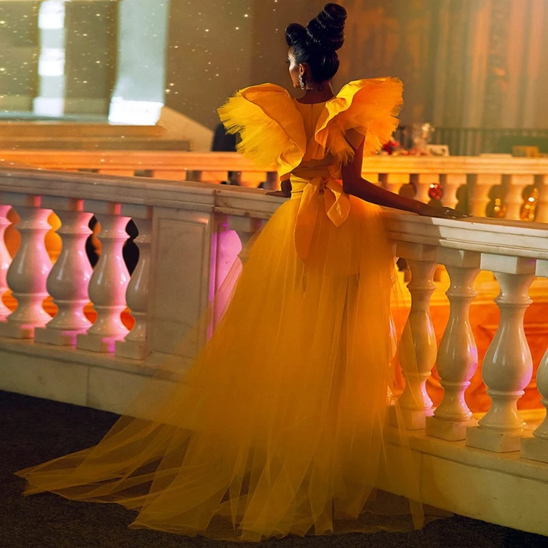 Длинное женское платье с оборками, из тюля, желтого цвета, без брет...