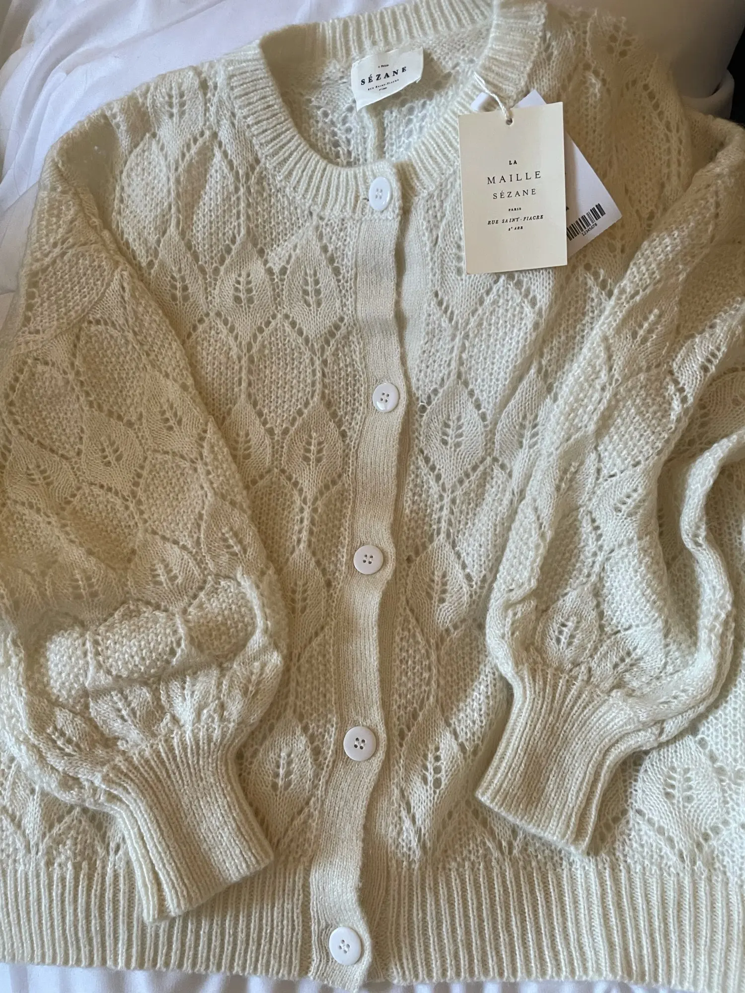 Le gilet correspondant exactement aux photographies et à sa description, il ressemble très exactement à celui de la marque avec exactement la même composition et les mêmes boutons. Il y a l’étiquette de la marque, même si ce n’est pas la bonne, ce n’est pas l’étiquette « la maille S... », il y a l’étiquette de composition et un bouton de rechange