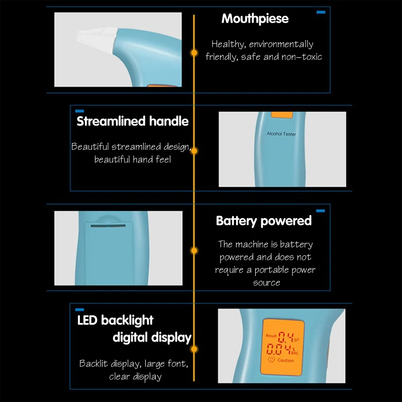 Описание товараЦвет: синийТеплые советы:Для того, чтобы получить более надежную запись, как можно скорее, советуем вам сделать тест не менее 20 минут после питья. Кроме того, пожалуйста, подождите как минимум 3 минуты, чтобы начать Следующий тест после последнего теста.Особенности Алкотестер:-Нано-Полупроводниковый спиртовой датчик-Управление одной кнопкой-Автоматическое отключение, энергосбережение-Цифровой ЖК-дисплей с оранжевой подсветкой-Функция быстрого отклика и восстановления-Автоматическая звуковая сигнализация-портативный дизайн-Умное управление MCUОписание:1. Цвет: синий2. Размер: 113*64*26 мм3. Датчик: Усовершенствованный полупроводниковый оксидный спиртовой датчик4. Диапазон: 0,00-019% BAC (0,0-1,9g/l)5. Рабочая среда: температура: от 5 до 40 градусов6. Точность:-0,01 ~ + 0.02% BAC (при 0.50% BAC)7. Мощность ток на входе: 2x1,5 V "AAA" щелочные батареи8. Время отклика: <5s9. Время работы: 10s10. Теплый: 10s11. Автоматическое выключение: 10 секунд после отображения результата