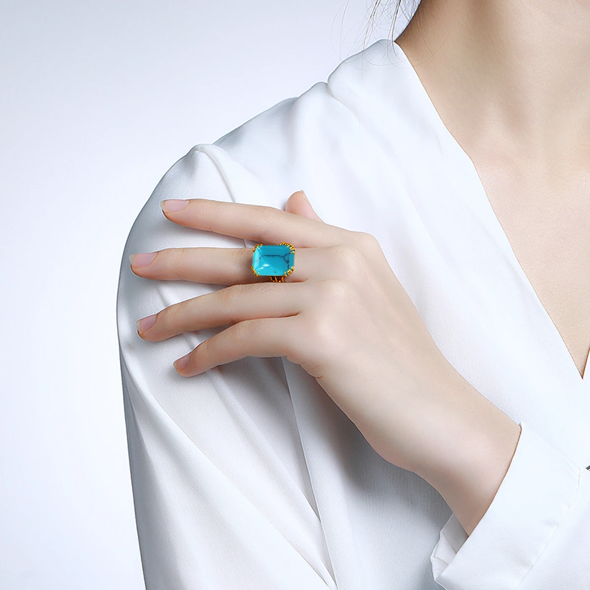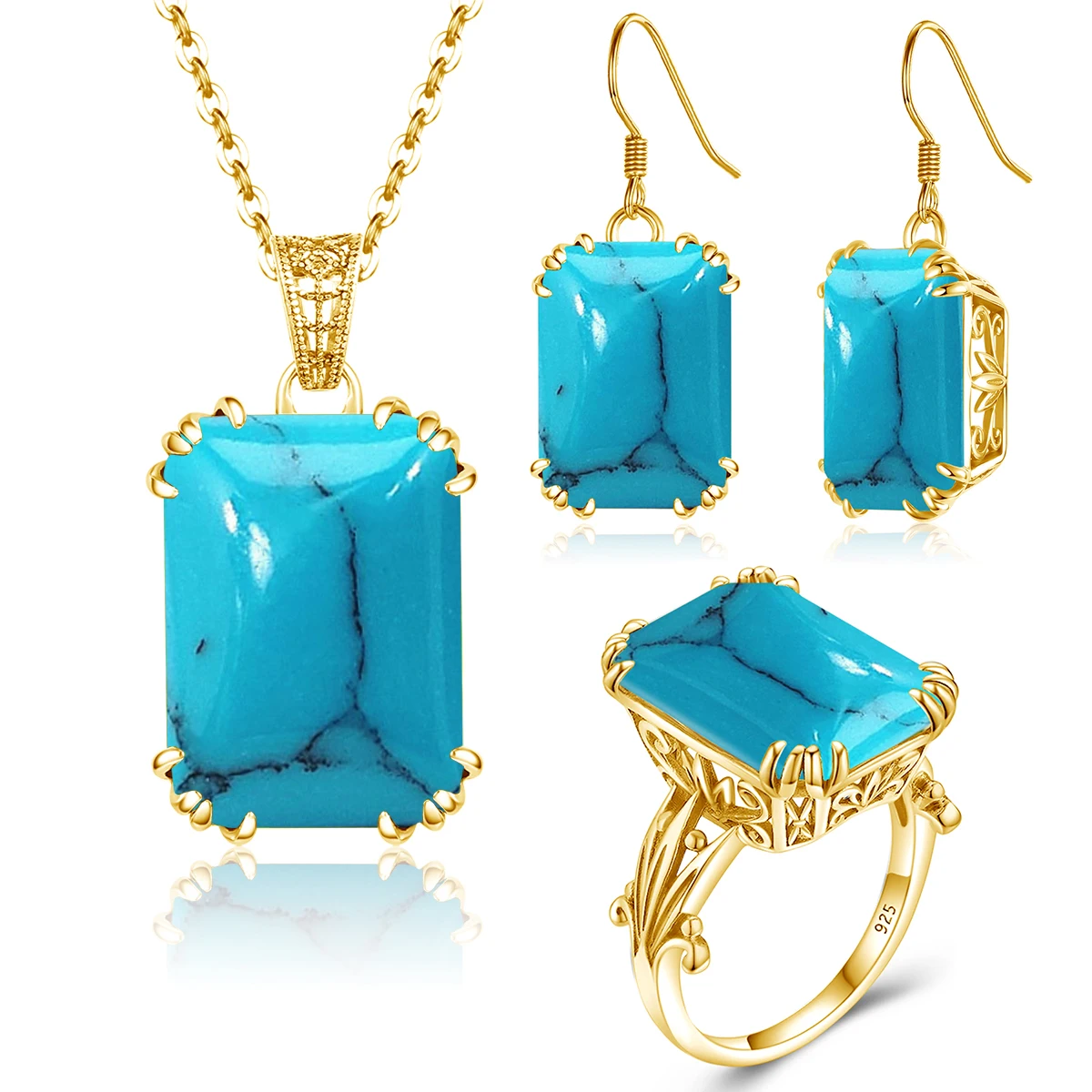Бренд: Rosewood StoryТип камня: синтетический бирюзовыйЦвет камня: как на фотоФорма камня: прямоугольникТип металла: 925 пробы серебро + позолотаВключает: кольца, серьги и ожерелье