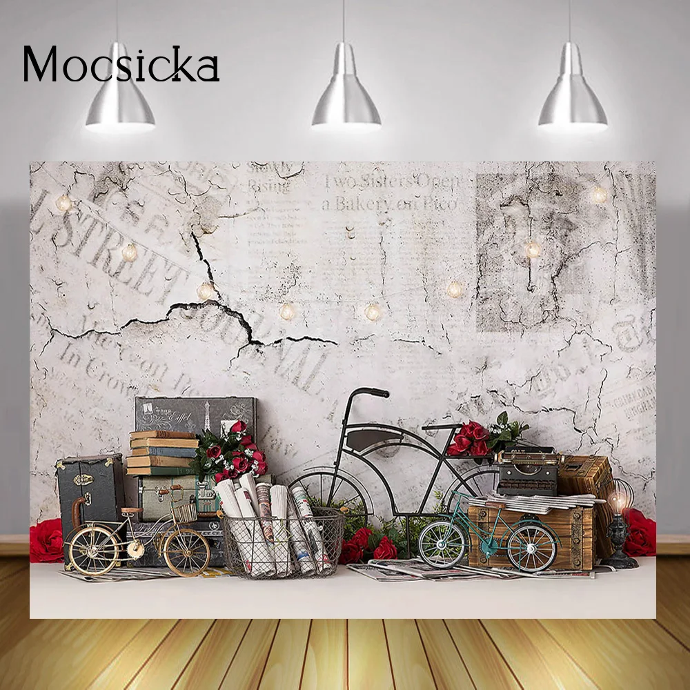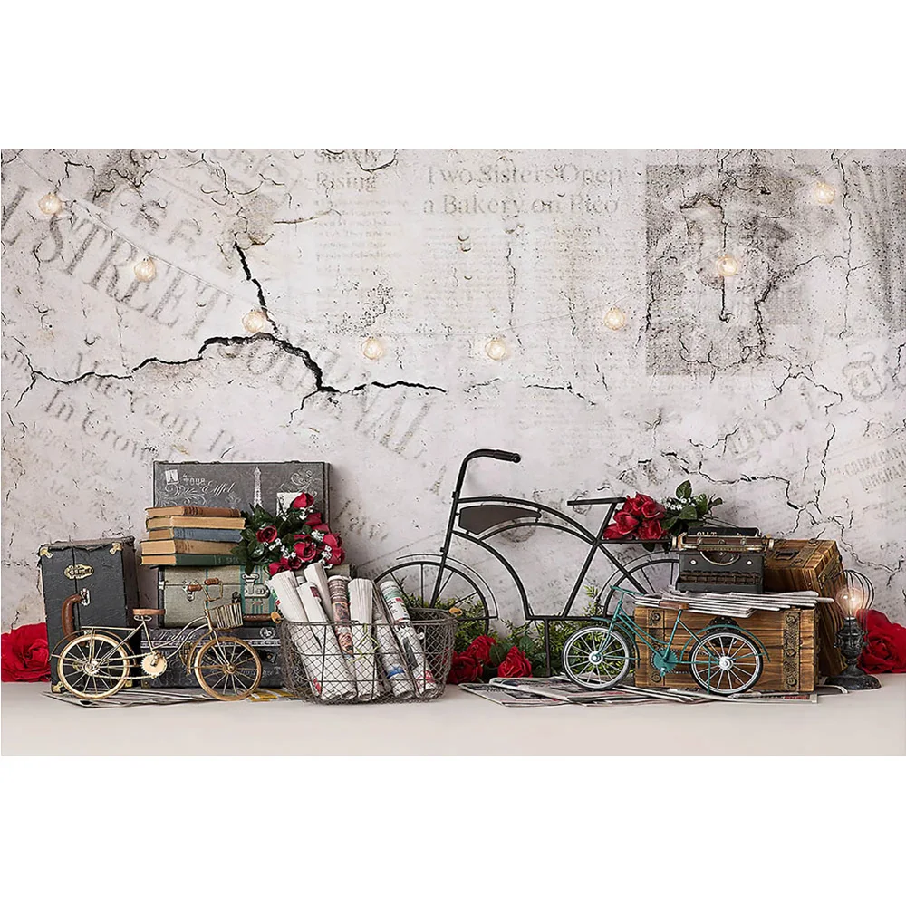 Фон для фотосъемки на День Св. Валентина с изображением белой кирпичной стены велосипеда красных роз