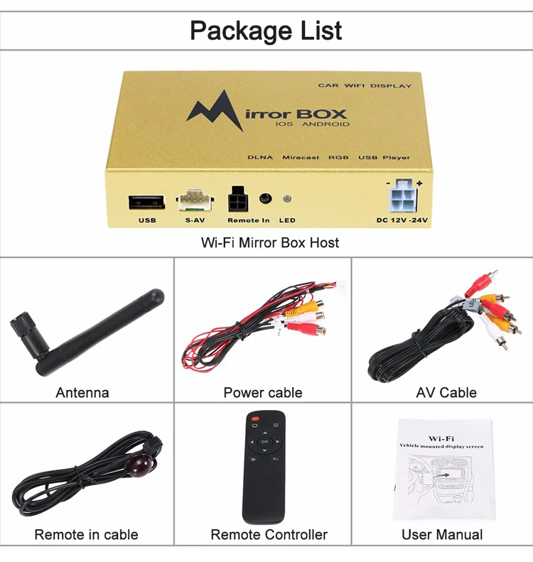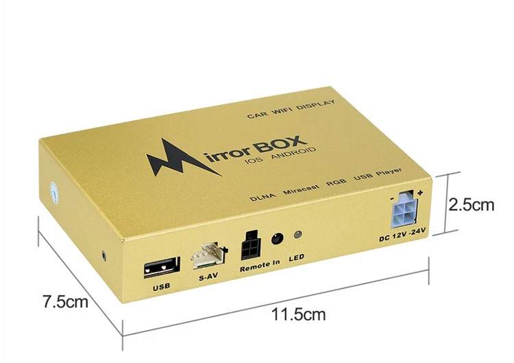 Это профессиональный автомобильный Стандартный Wi-Fi a/V зеркальный преобразователь для смартфона, планшета и других устройств, который передает аудио и видео смартфона или планшета (экран в режиме реального времени) на Автомобильный плеер. С помощью этого устройства вы сможете лучше развлекаться в автомобиле.Особенности:Высококачественный металлический дизайн.Поддержка iOS и andriod системы.Поддержка различных устройств с функцией Wifi.Передача информации о навигации, аудио, видео, играх на экран вашего автомобиля.Полезно, когда вам нужно проверить информацию о вашем телефоне, pad и т. Д.Получите больше удовольствия от этого продукта.Характеристики:Операционная система: LinuxЯзык: китайский, английский... Поддержка нескольких языковSDRAM: DDR3 1G битNOR Flash: 1G битЧастота: MIPS 600 МГцРасстояние передачи: до 20 м для воспроизведения музыки, фото и pdf файлов; До 15 м для воспроизведения видео файлов.Скорость передачи данных: до 8 Мбит/сСеть: WiFi 802,1 b/g/nВходная мощность: 12 В постоянного токаВход: WiFi AirPlay & Miracast/Allsharecast/зеркальное отображение экрана/DLNAВыход A/V: автомобильный аудио AUX/CVBS/YUV (опционально)Диапазон температур: от-20C до 70CВлажность: 0-90%Размер: 12*8,5*2,4 смРазмер посылка: 20*16*10 см/7,9*6,3*3,9 дюймовПосылка Вес: 558g / 1.2lbПосылка:1 * хост зеркальной коробки1 * кабель питания1 * av-кабель1 * антенна1 * Руководство пользователя на английском языке