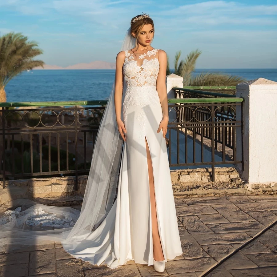 Жасминовое свадебное платье без бюстгальтера, с круглым вырезом, без рукавов, с разрезом, атласное шифоновое пляжное платье для невесты