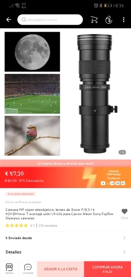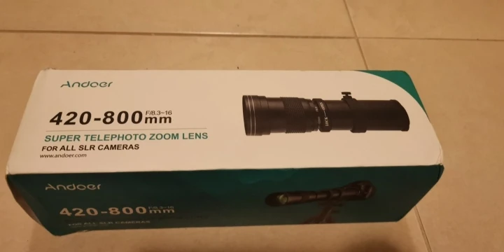 Продукт отправлен быстро, скоро прибудет домой, так же, как описание, металлический корпус, некоторые незначительные дефекты с точки зрения цвета и стабильности, Вес объектива генерирует «torcimientoc, однако это очень хорошее качество изображения в первых тестах. Прикрепленные фотографии .. Дерево около 50 м груди 20 см... Луна менанте в середине дня