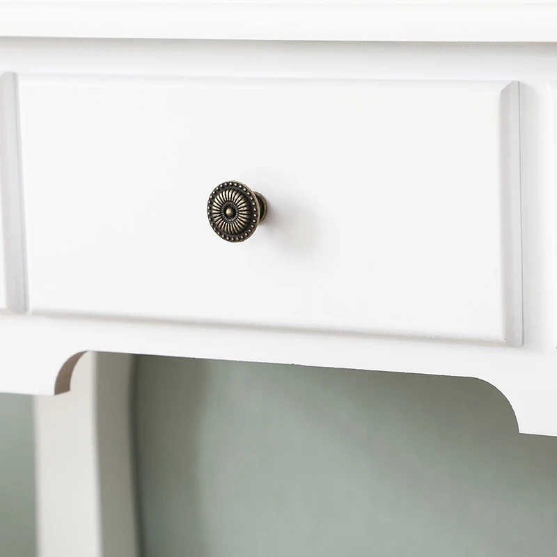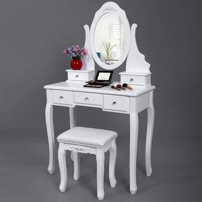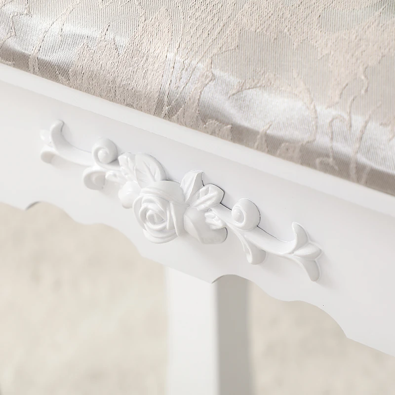 Современный дизайнНабор туалетного столика может быть частью функциональной и прочной мебели для вашей спальни, шкафа, ванной комнаты или прихожей.Резной туалетный столикСовременный и великолепный туалетный столик создает стильный образ в вашей комнате. Изящный дизайн с вырезами придает элегантности таблице макияжа. Милые ручки ящика-это сочетание использования и красоты. Это удобно в использовании и добавляет чувство моды в то же время.Прочные деревянные ножкиИзготовлено из толстого материала и деревянных ножек, этот туалетный столик прочный и крепкий и имеет большой вес одновременно. Уникальный дизайн ноги не только приятен для глаз, но и для стабильности.Большое пространство для храненияВсего пять ящиков, большое пространство для организации ваших ювелирных изделий, косметики и других личных вещей.Легко собираетсяТребуется простая сборка, все детали и инструкции включены.