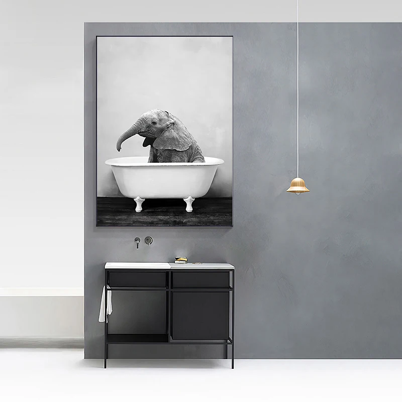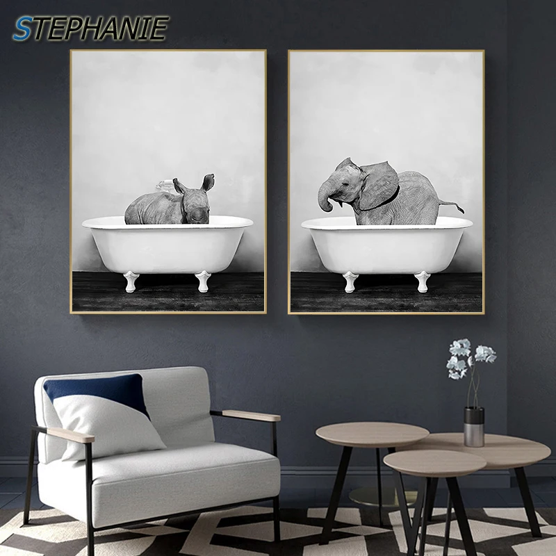 Черно-белая картина для ванны с животными, настенный постер со слон...