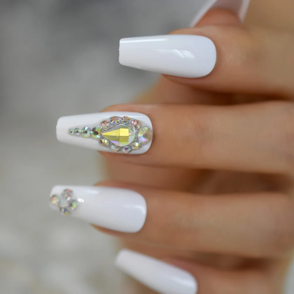 Глянцевые белые 3D блестящие драгоценные камни Holo, французский гроб, балет, накладные ногти, накладные ногти балерины, многоразовая одежда, 24 шт.компл.