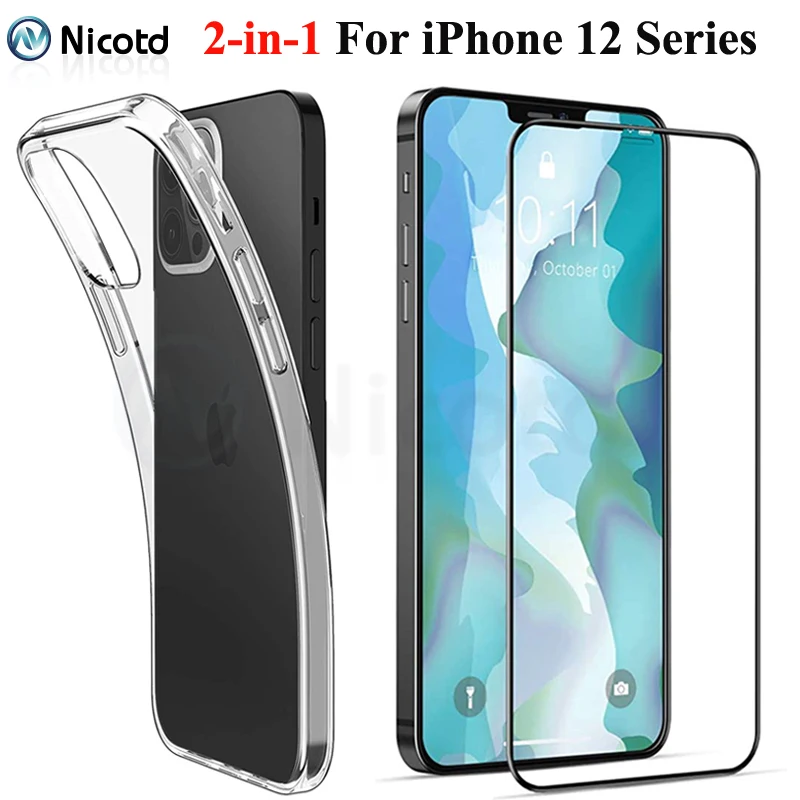 Переднее закаленное стекло и чехол 2 в 1 для iPhone 12 Pro Max, Защита экрана для iPhone 12 mini, 12 Pro