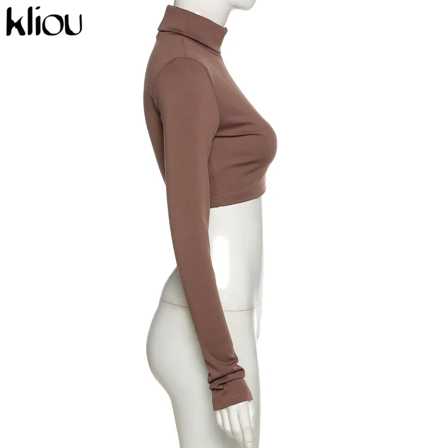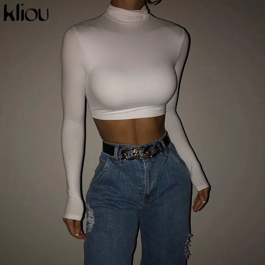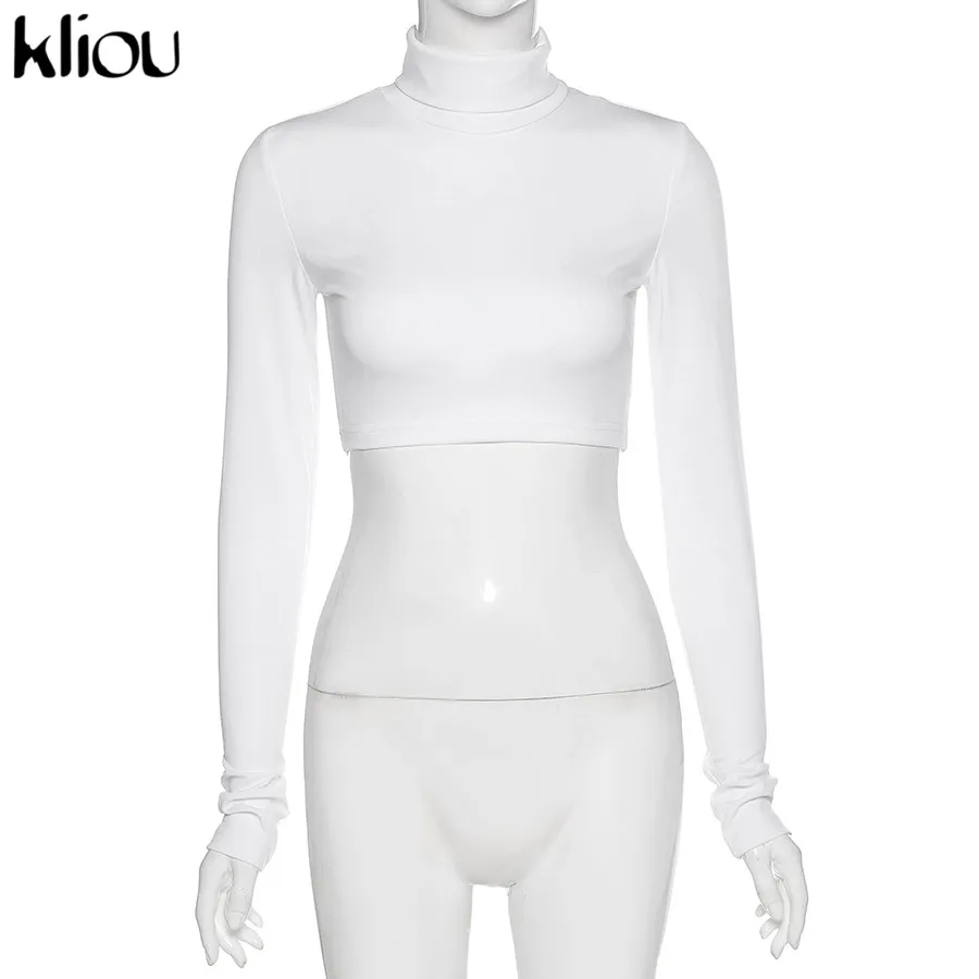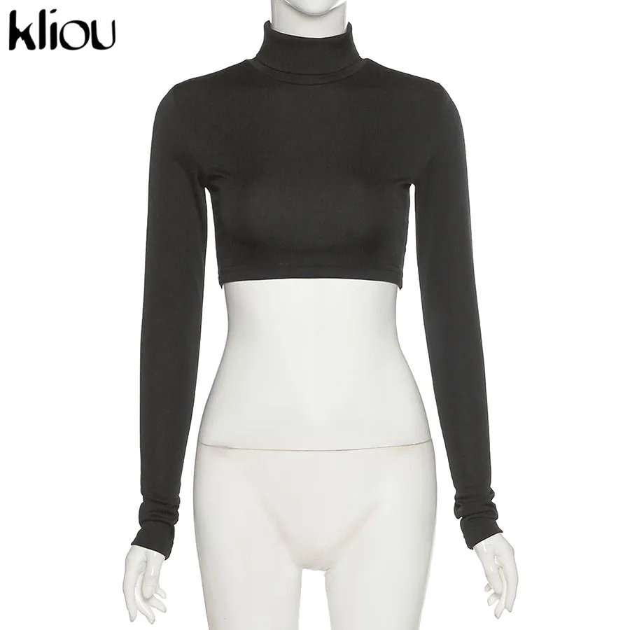 Kliou Однотонные эластичные облегающие футболки для женщин, водолазка, Повседневная Уличная одежда, укороченный топ, обтягивающие тонкие женские базовые футболки, хит продаж