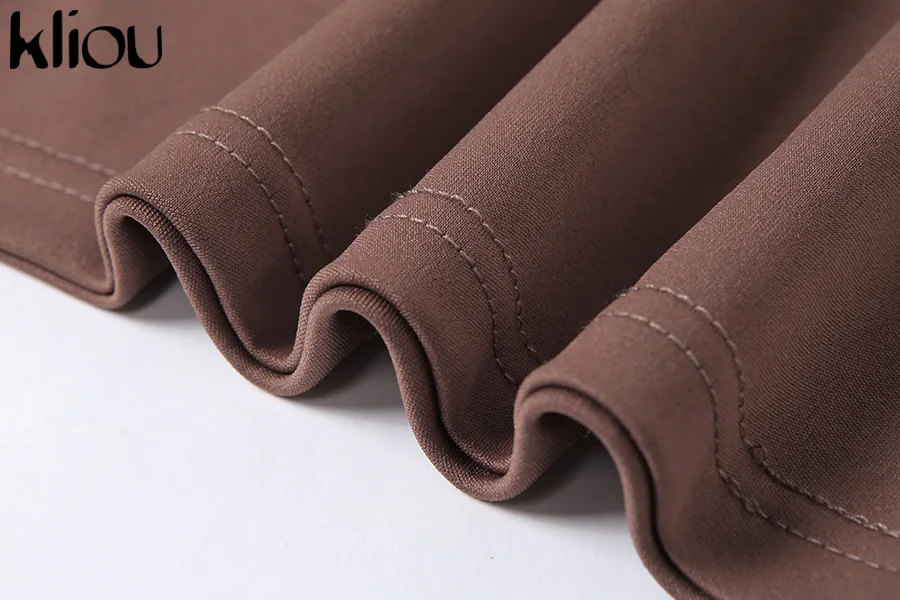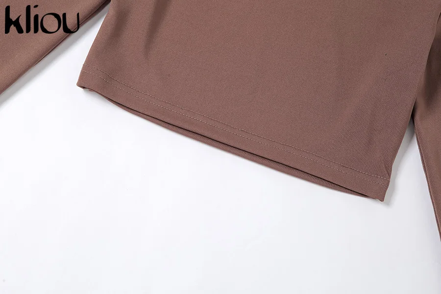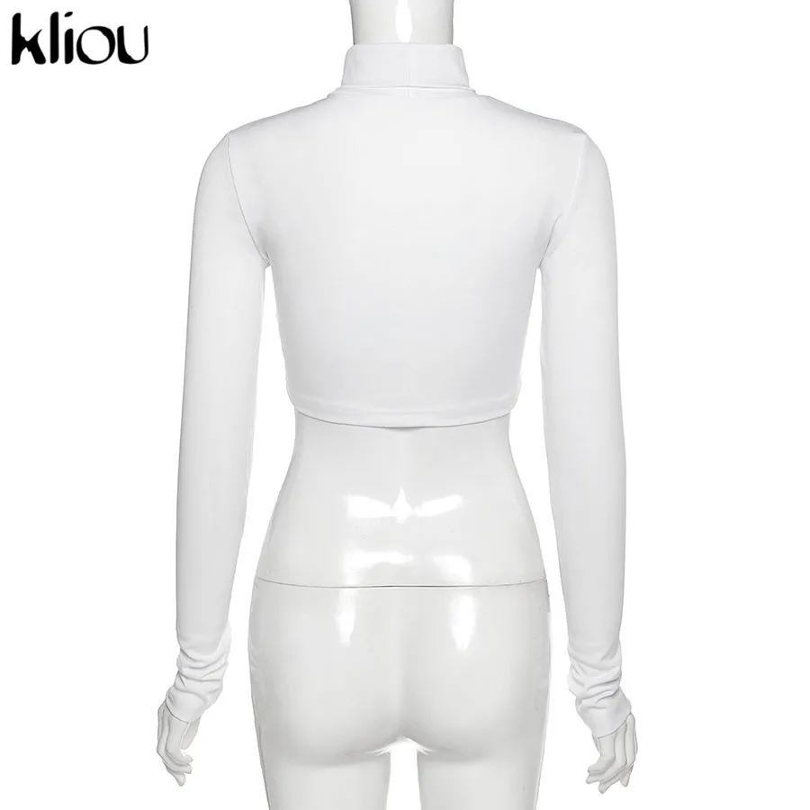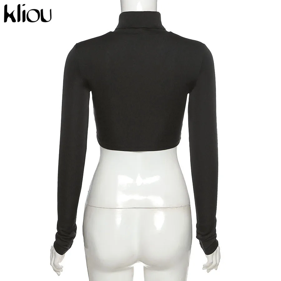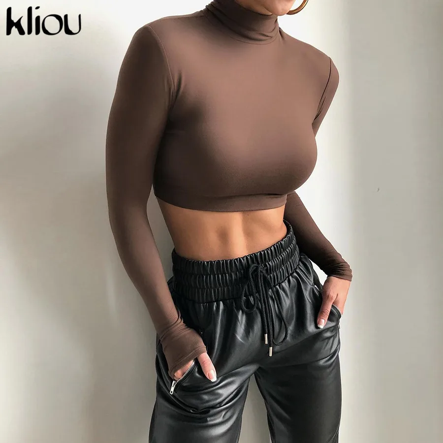 Kliou Однотонные эластичные облегающие футболки для женщин, водолазка, Повседневная Уличная одежда, укороченный топ, обтягивающие тонкие женские базовые футболки, хит продаж