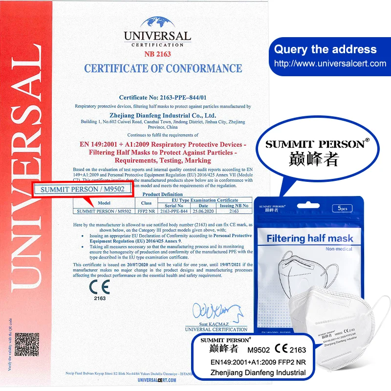 1. Сертифицированные CE FFP2 маски должны быть напечатаны с логотипом «CE», номером тела, «FFP2 NR», уровнем защиты и стандартом тестирования» EN149:2001 + A1:2009 "для соответствия законодательству ЕС.
