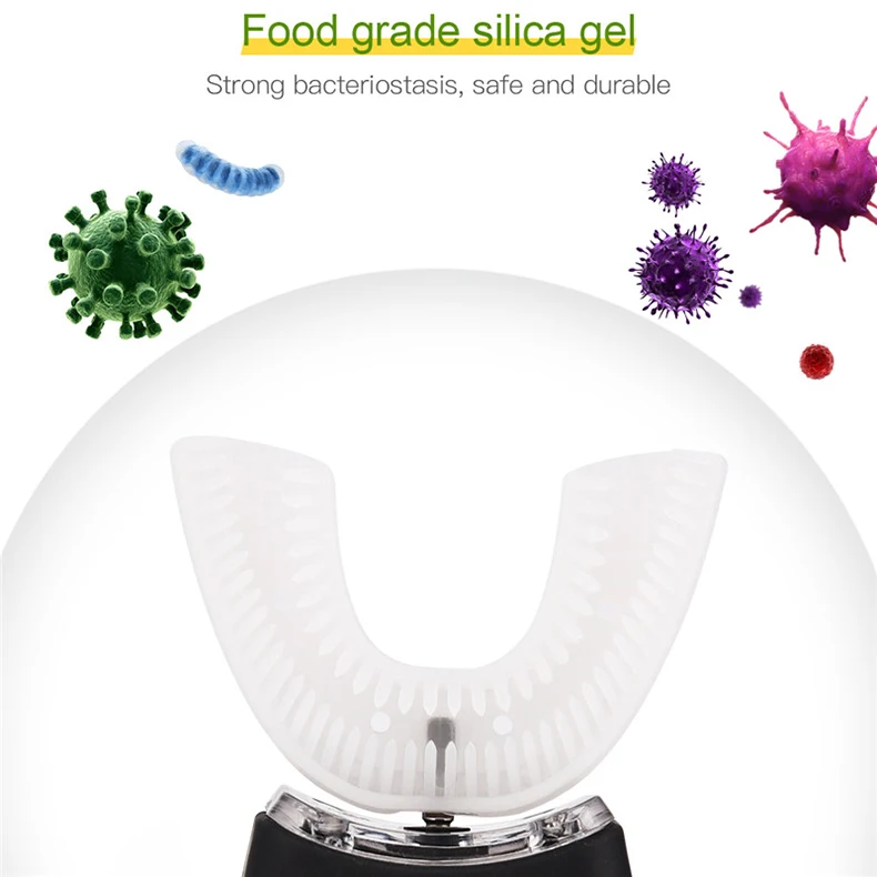 Характеристики:Цвет: белый/черный/розовый/синийМатериал: силикон + АБС-пластикФорма: u-образныйУгол: 360 градусовЗарядка: USB-интерфейс для зарядкиРазмер продукта: как на картинкеВремя очистки: 45 секундЧастота: 4800 раз/минВодонепроницаемость: IPX7Особенности:1. Уникальная U-образная насадка, соответствующая форме зубов, высокочастотная вибрация звуковой волны, может быстро и аккуратно очистить поверхность и внутреннюю часть зуба одновременно на 360 °, устранить 99.99% бактерий в ротовой полости и обеспечить защиту здоровья зубов.2. Отбеливание нано-сисветильник Том, низкотемпературное облучение зубов сисветильник Том, стерилизация, отбеливание, массаж десен.3. Идеальное сочетание чистки, отбеливания и прочего, придает зубам эффект очистки на 360 градусов.4. Насадка из пищевого силикона, не вызывает аллергии, безопасна в использовании.5.U-образная конструкция: предназначена для идеального облегания рта человека, при вибрации 48000 об/мин очищает зубы без мертвых углов. Примечание:1. Нормальная рабочая температура продукта 0 °C-50 °C.2. Когда устройство заряжается, зарядите его при нормальной температуре из-за характеристик продукта.3. Когда продукт не используется в течение длительного времени или находится в течение длительного времени, рекомендуется зарядить и разрядить его в течение трех месяцев.4. Продукт максимально хранится в сухих и прохладных местах и защищает от солнечных лучей.5. После чистки зубов используйте влажную ткань, чтобы очистить воду и застой корпуса, и старайтесь избегать замачивания в воде.6. Выходная мощность продукта большая, работать в течение длительного времени запрещено. Обычно это менее чем за 10 минут.7. Во время зарядки Опустите головку щетки и держите корпус в сухой ванне. Блок питания на менее чем за 10 минут.Как использовать:Пожалуйста, внимательно прочтите инструкцию. Посылка:1 электрическая зубная щетка1 * USB кабель1 * Руководство пользователя