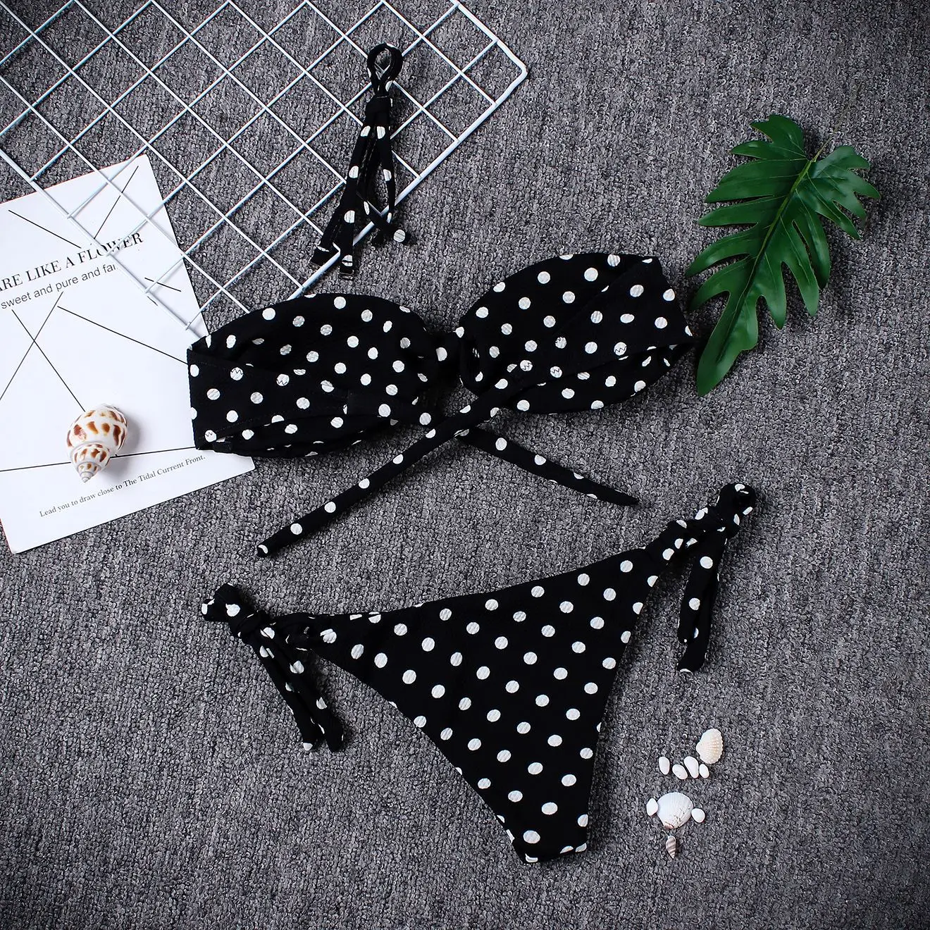 Популярный Сексуальный Женский бандо без бретелек с пуш-ап в горошек, комплект бикини на шнуровке, женский летний купальник, пляжная одежда